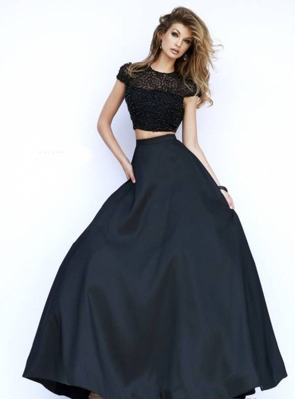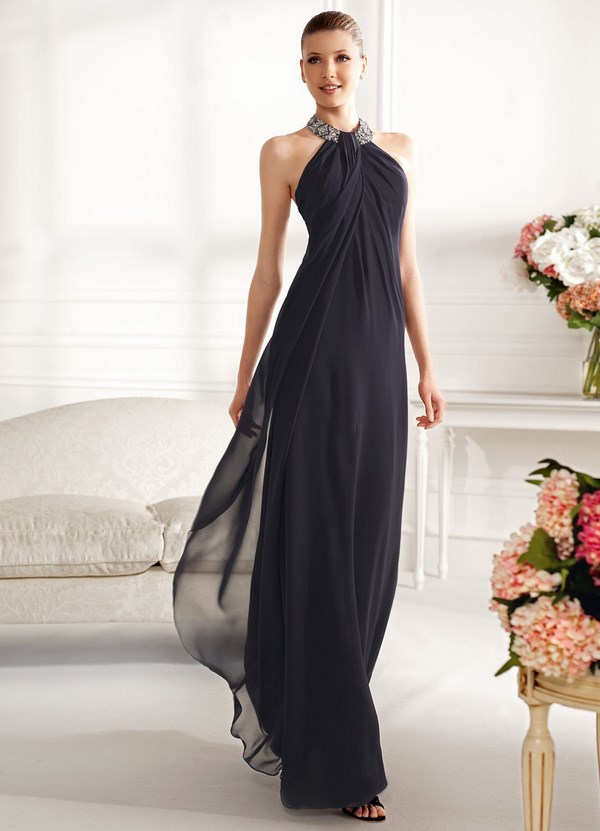 Versi canggih dan misteri pakaian untuk petang adalah gaun lantai panjang hitam mewah dengan rok penuh atau lurus, dihiasi dengan kain tirai, kain tekstur, bulu dan rhinestones laconic.