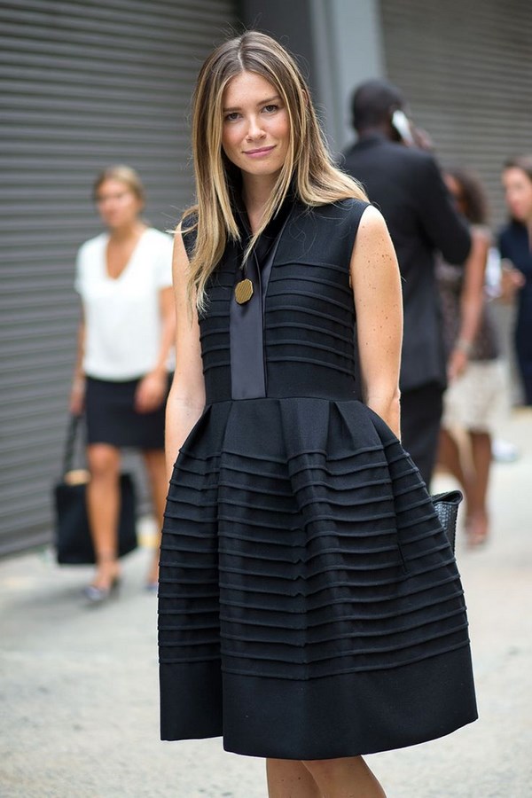 Untuk pejabat gaya perniagaan, pakaian sarung hitam, panjang lutut dan tanpa garis leher yang mendalam, yang menekankan angka dan akan kelihatan ringkas dan bergaya, paling sesuai.