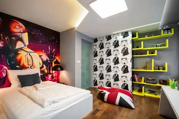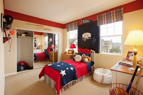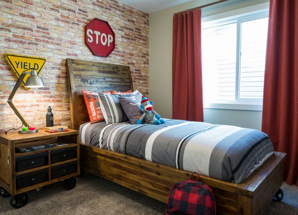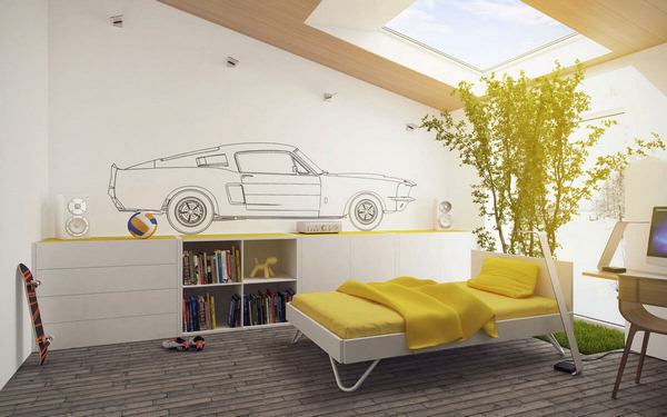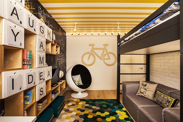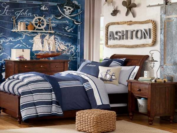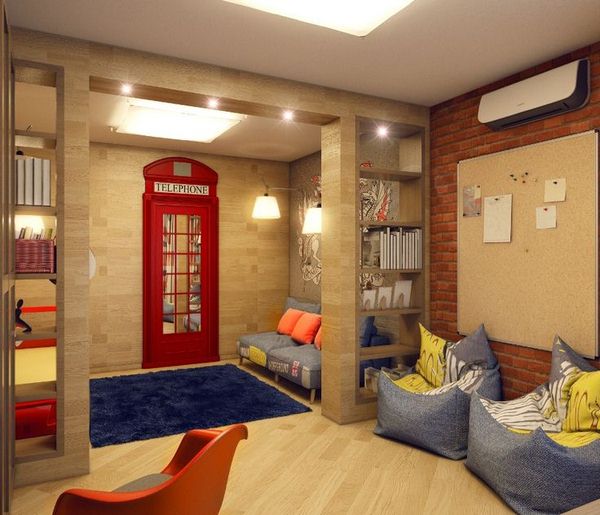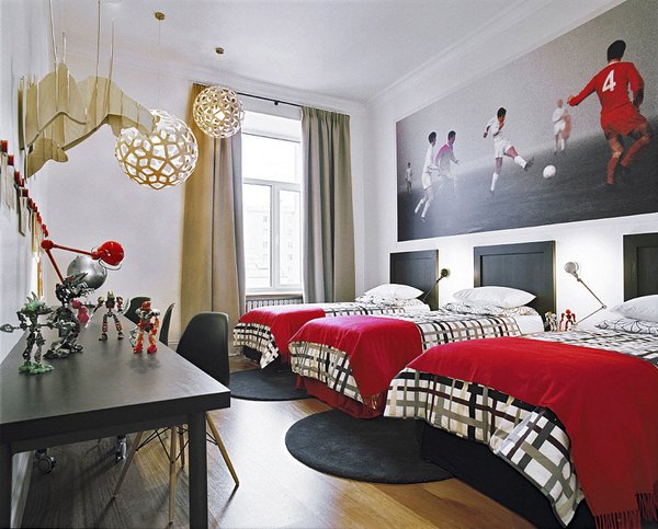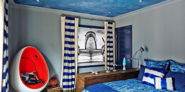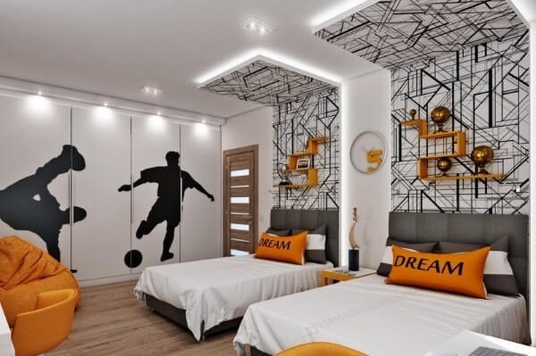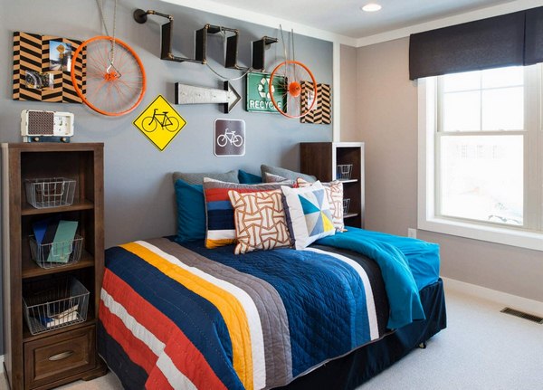 Juga jangan lupa tentang elemen hiasan yang akan memberi inspirasi kepada lelaki itu - ini adalah aplikasi di dinding, mencetak dengan wira-wira kegemaran atau sukan anda, dan banyak lagi.