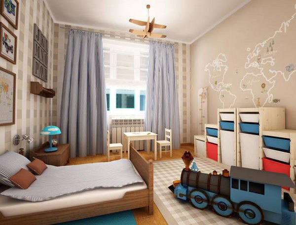 Untuk mempelbagaikan reka bentuk bilik kanak-kanak untuk seorang budak lelaki, anda juga boleh mengambil bantal cerah untuk sofa, penutup luar biasa, elemen hiasan untuk meja dan dinding, serta papan magnetik atau papan untuk lukisan, atau peta geografi.