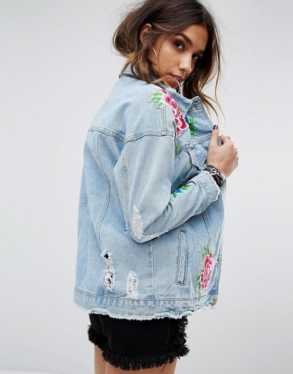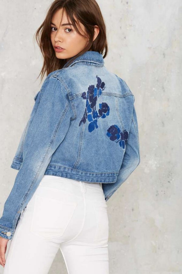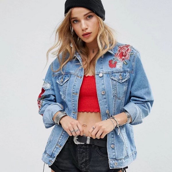 Jaket denim timbul dengan sulaman dan perhiasan kelihatan terutamanya asli dengan pakaian petang, memberikan imej yang bergaya dan canggih. Jaket denim dipangkas juga berguna untuk melengkapkan pandangan anda dengan seluar pendek dan seluar jeans, seluar dan seluar.