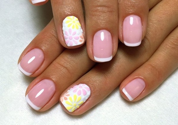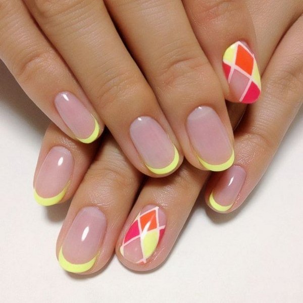 Manicure Perancis dalam pic pucat, merah jambu, kuning air, warna pasir gel menggilap sesuai untuk hampir semua pakaian dan kelihatan harmoni pada panjang kuku yang berbeza.