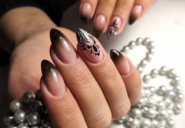 Manikur petang Perancis tidak akan dilakukan tanpa motif renda, monogram dan keriting comel yang dibuat dalam warna yang halus dan kontras, yang menjadikan manicure lembut dan halus.