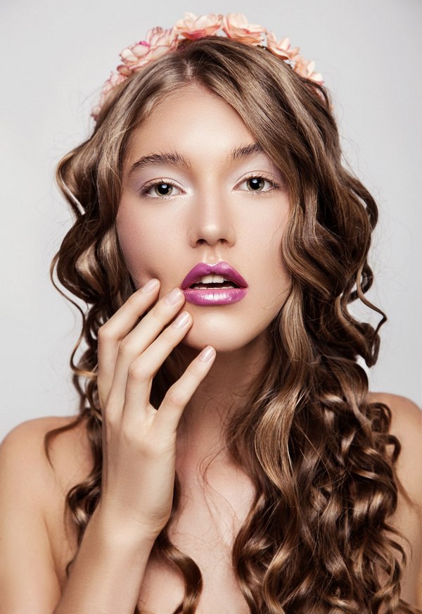 Rambut yang indah dengan panjang yang berbeza, bergaya menggulung ke keriting dan diletakkan, memberikan imej daya tarikan dan kewanitaan yang istimewa.