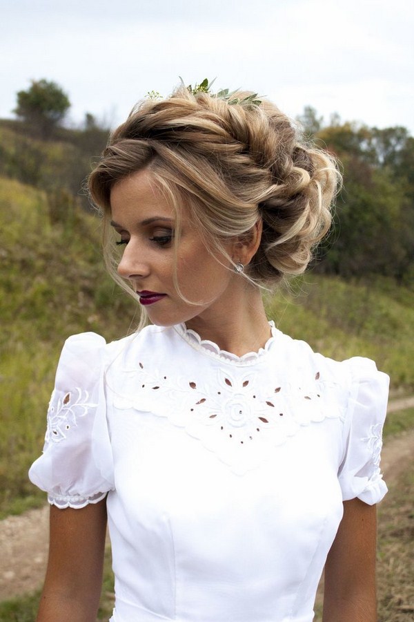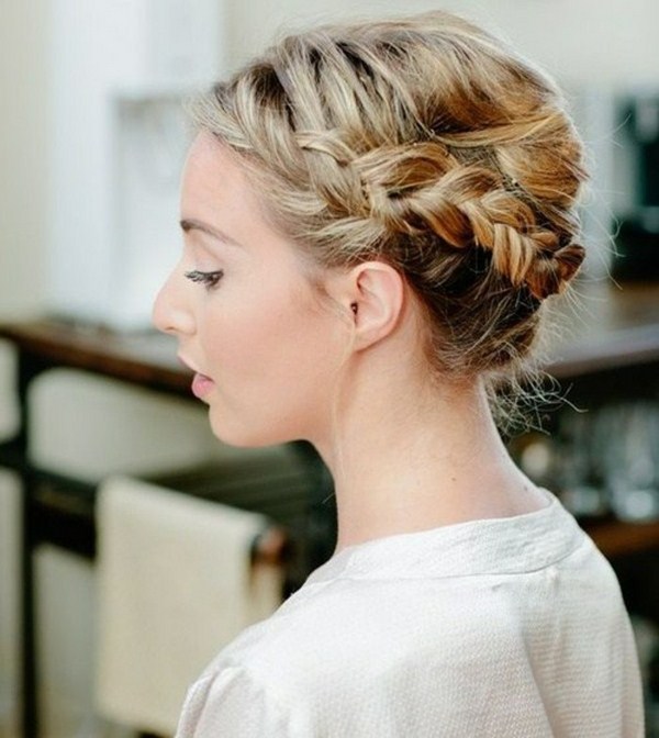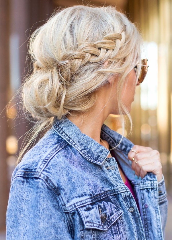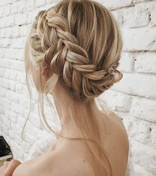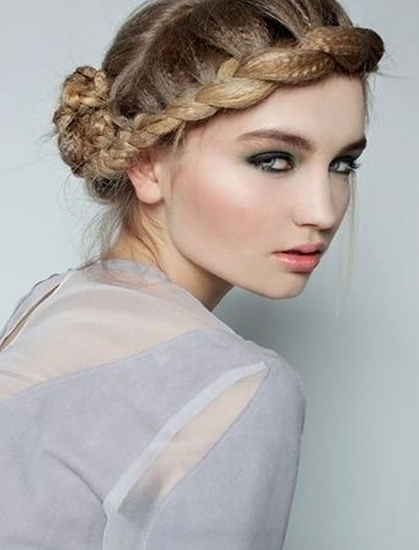 Gaya rambut yang cantik dengan braiding dan bun - ini sentiasa idea gaya rambut yang halus dan elegan untuk rambut panjang dan sederhana yang sesuai dengan banyak gadis.