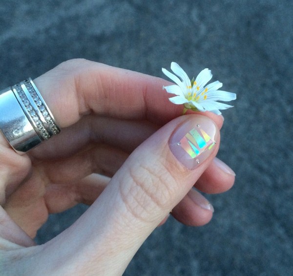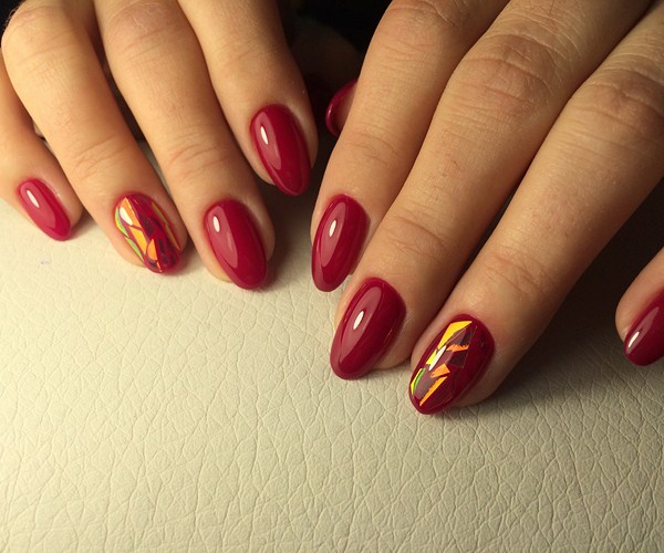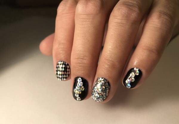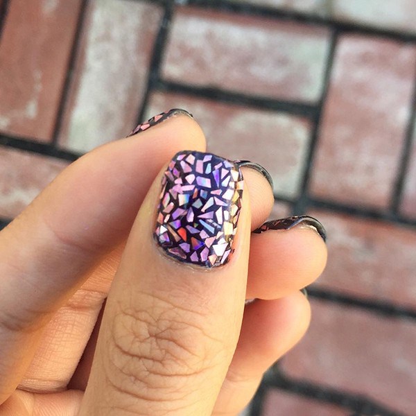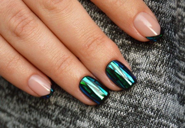 Pelekat hologram, selofan dengan kesan cermin dan kerangka warna yang berbeza digunakan untuk melaksanakan kesan "pecah kaca" pada kuku.