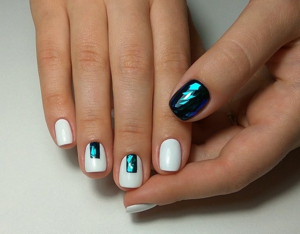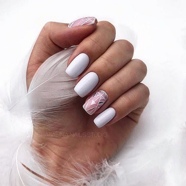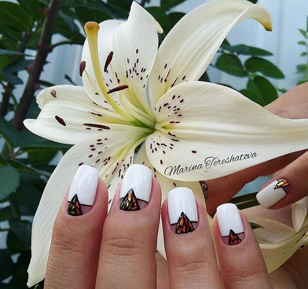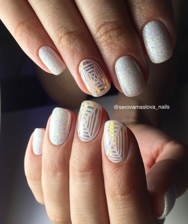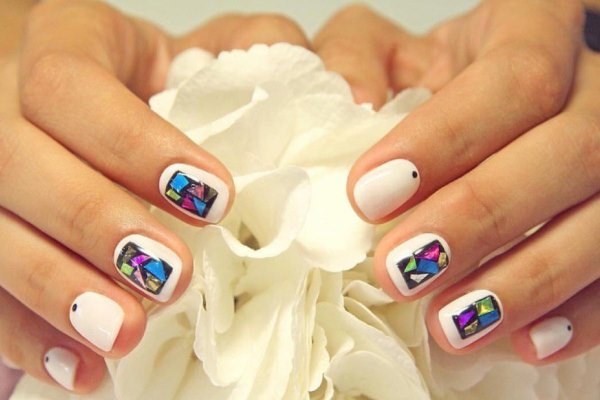 Manicure trend kaca pecah juga boleh dilakukan dengan warna putih dengan warna foil yang berbeza. Kuku dengan "pecah kaca" dan salutan lutut atau kuku pepejal akan kelihatan lembut.