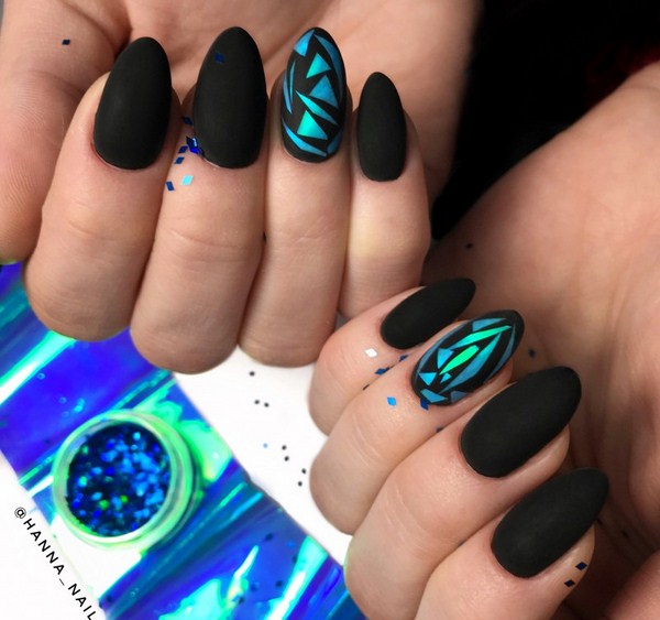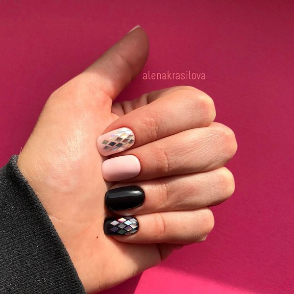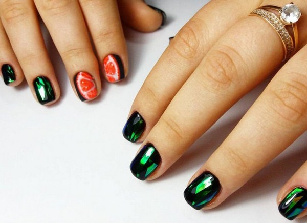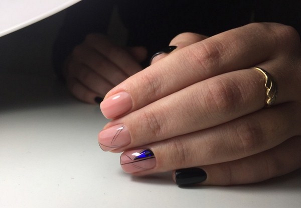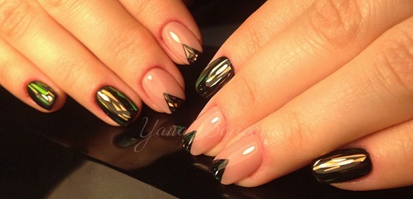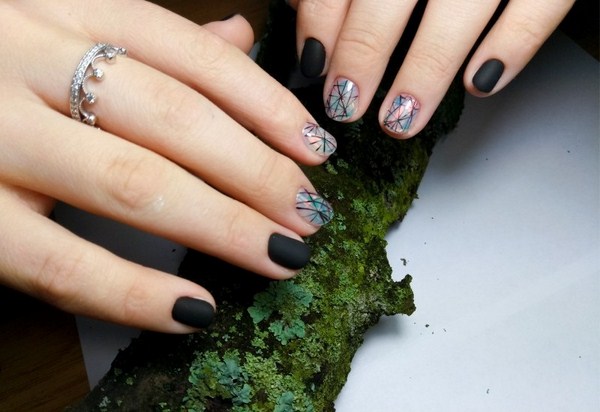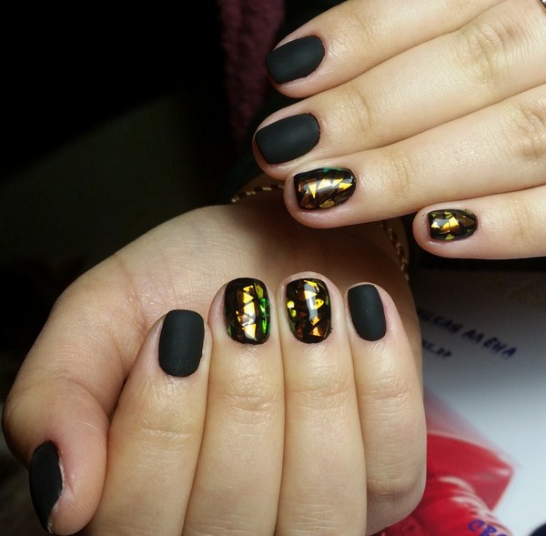 Salah satu yang paling hebat boleh dipanggil manicure hitam "kaca pecah". Terima kasih kepada lapisan gelap, kepingan-kepingan kerajang kelihatan lebih cerah, terutamanya nada-nada emas dan perak dalam manicure "kaca pecah".