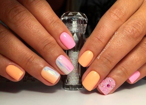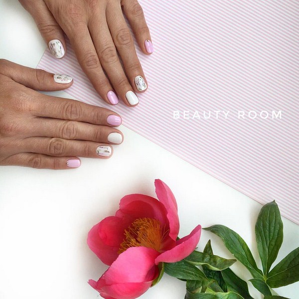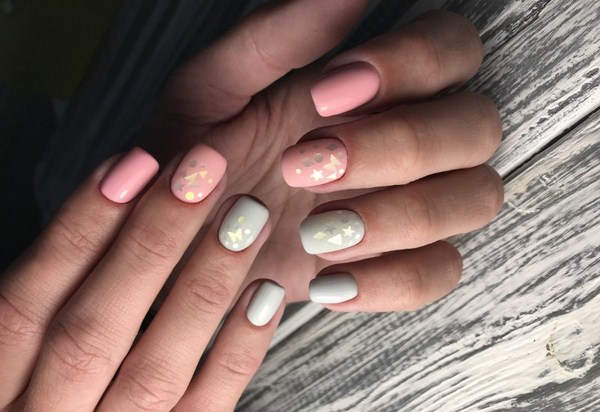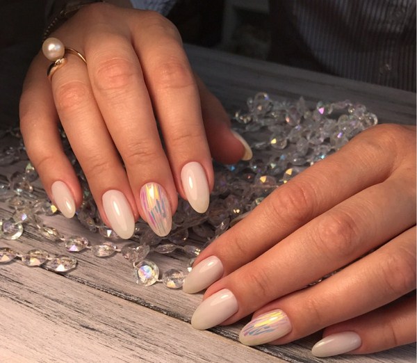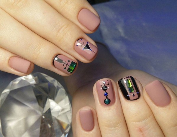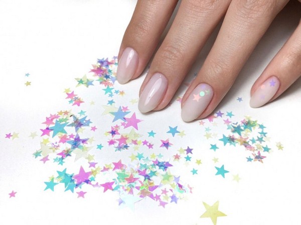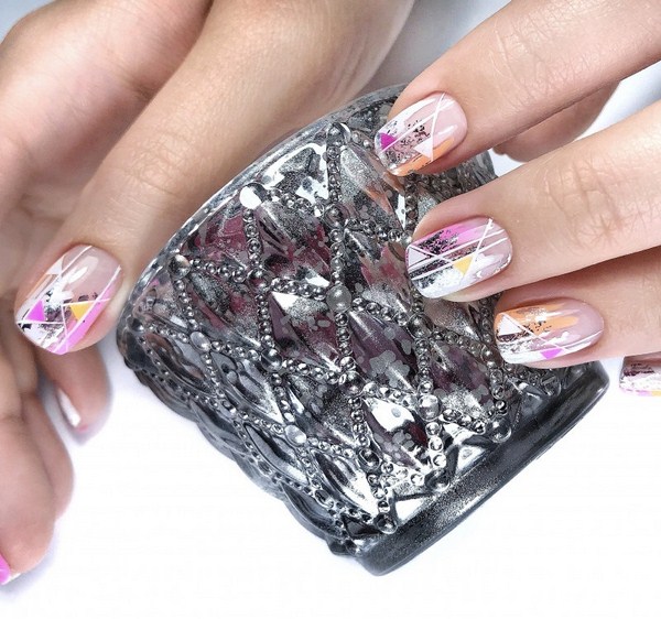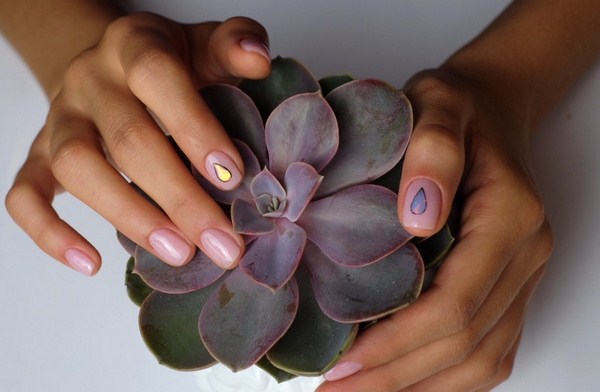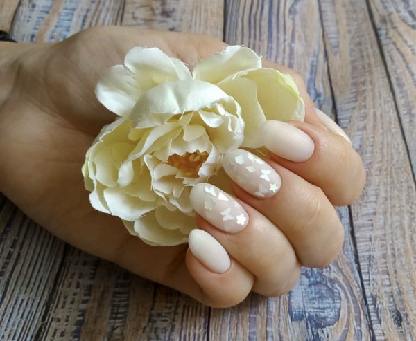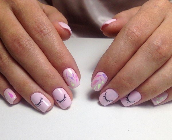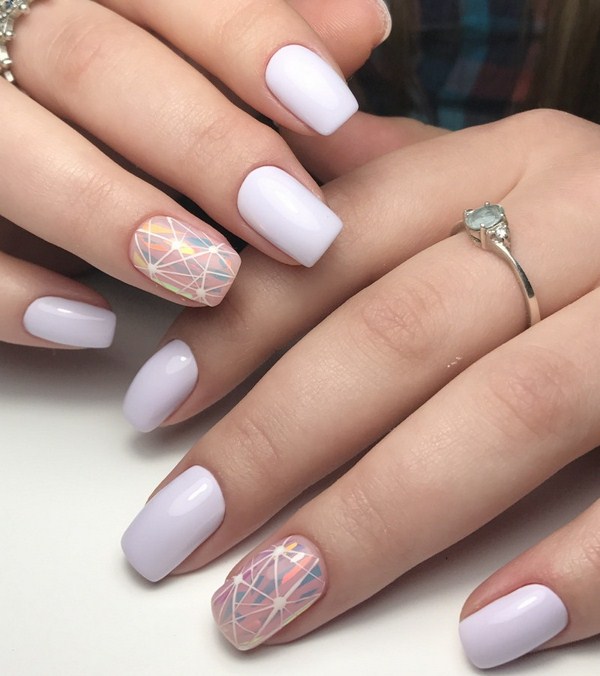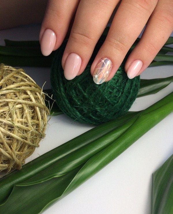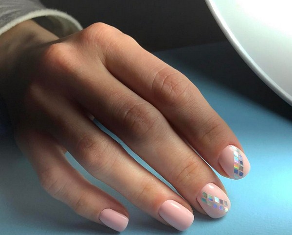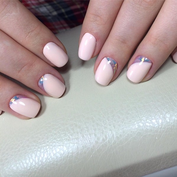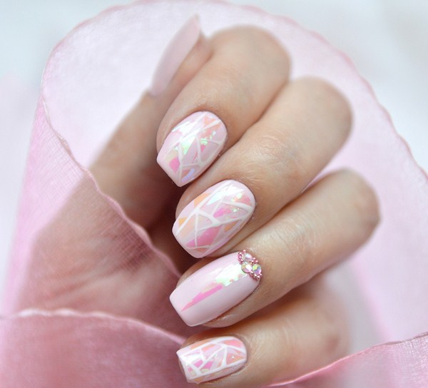 Sekiranya anda mahukan manicure kaca pecah yang sangat canggih, 2025-2026, maka sebaiknya melihat roman, hati, bulatan, bintang, bintang, segitiga dalam warna pastel yang lembut.