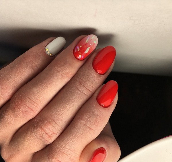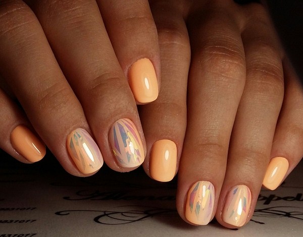 Manicure dengan kaca pecah dan peralihan warna kecerunan kelihatan hebat. Ambil beberapa warna kegemaran dalam warna yang halus atau tepu dan buat kecerunan yang menarik dari jari ke jari. Hiaskan sepasang ombre marigolds dengan pecahan foil. Reka bentuk kuku yang sama 2025-2026 akan kelihatan comel, memberikan keanggunan kepada pemegang.