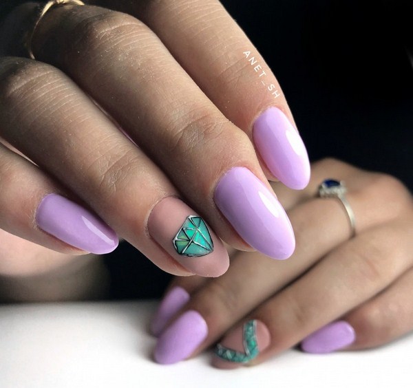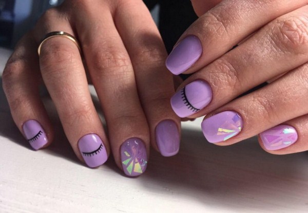 Reka bentuk trend kaca pecah kelihatan hebat dan mandiri tanpa sebarang hiasan. Tetapi masih anda boleh mencuba cetakan comel atau indah, jika anda mempunyai keinginan sedemikian. Tetapi cetakan mestilah ringkas dan mudah, supaya "serpihan" tidak kehilangan semua pesona mereka dalam seni kuku yang bergaya. Idea menarik mungkin menarik silia pada jari-jari yang bersebelahan dengan kaca pecah. Manicure kaca pecah kaca yang mudah dan bergaya 2025-2026 dengan lukisan akan menambah sentuhan ringan ke paparan anda.