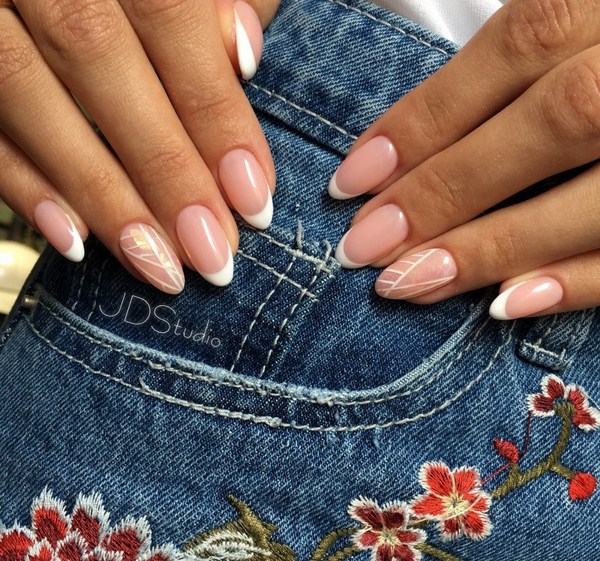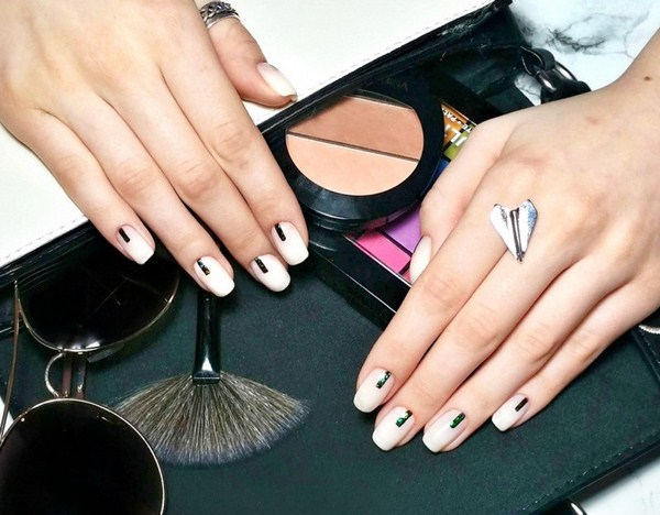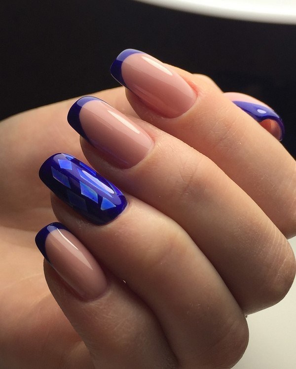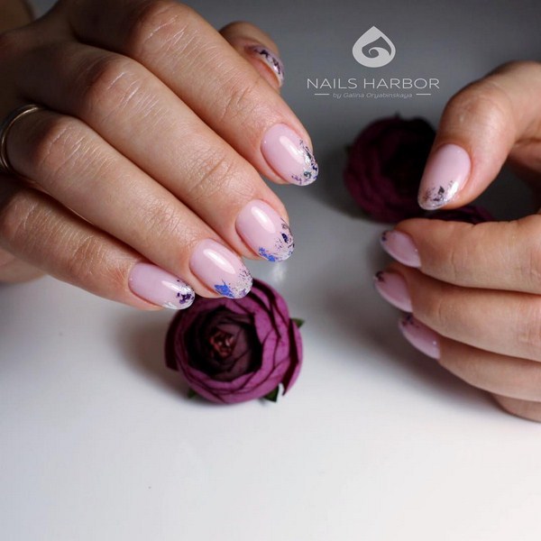 Penyelesaian kuku atas untuk manicure kaca pecah ditunjukkan dalam gaya Perancis, dengan kecerunan warna, lubang, yang akan menjadi pencinta seni kuku tradisional dan kaca pecah luar biasa pada kuku.