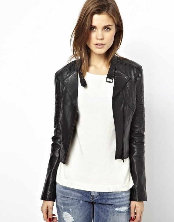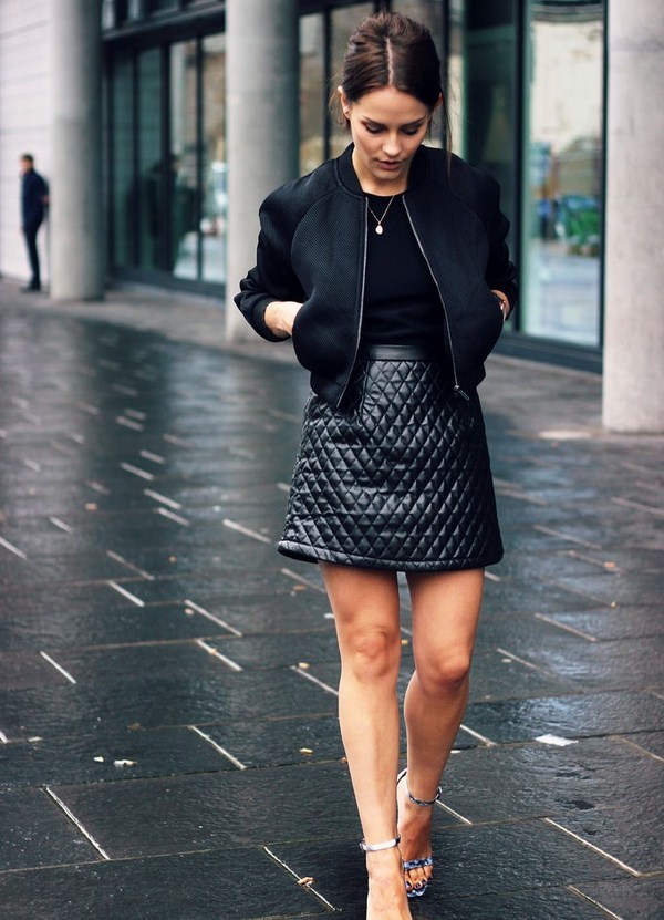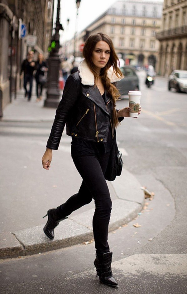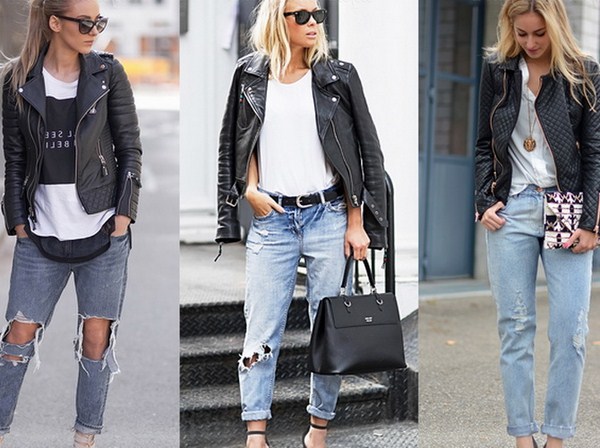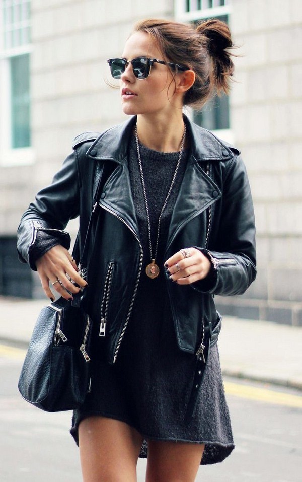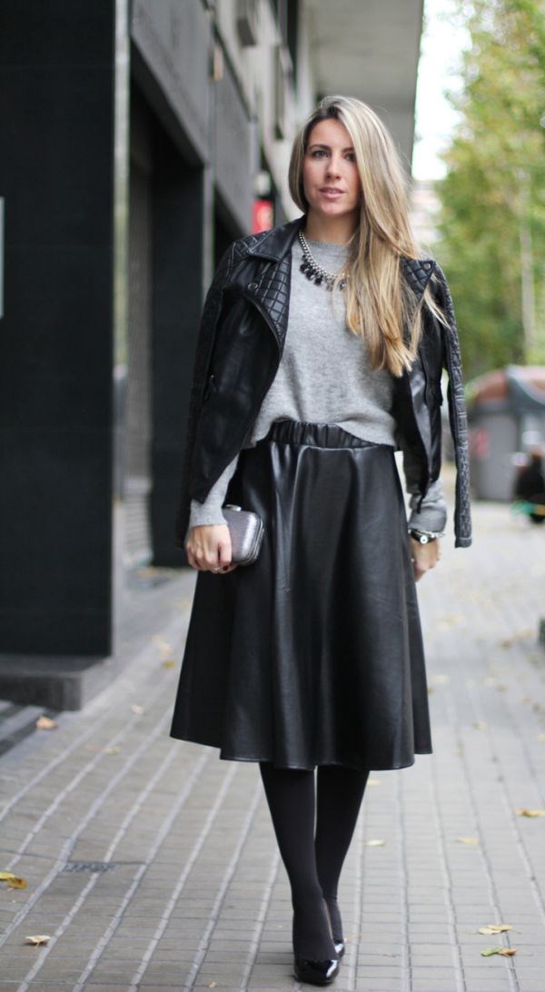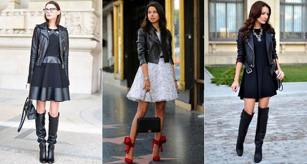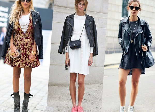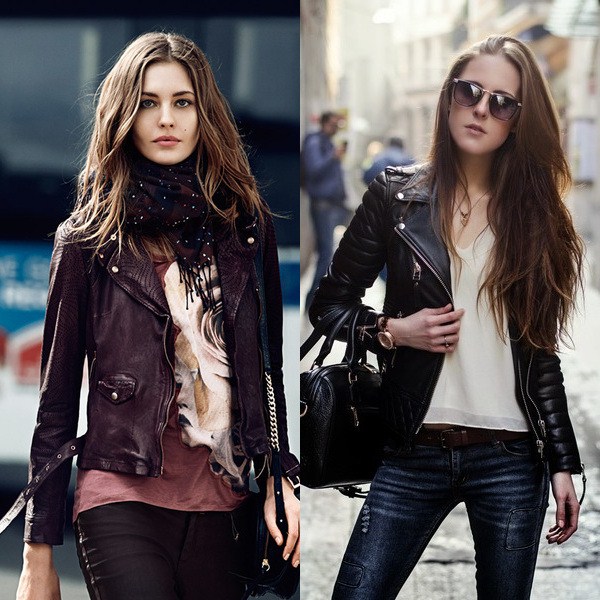 Jaket kulit bergaya sempurna digabungkan dalam busana malam bergaya dengan pakaian dalam gaya yang berbeza dan aksesori yang cantik.