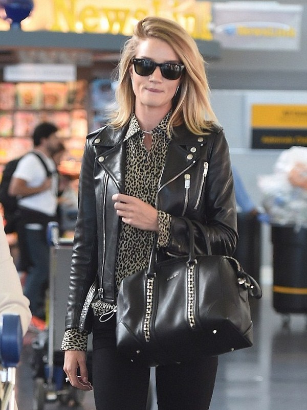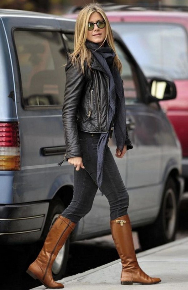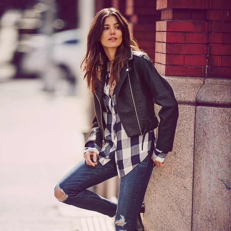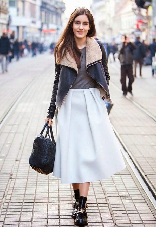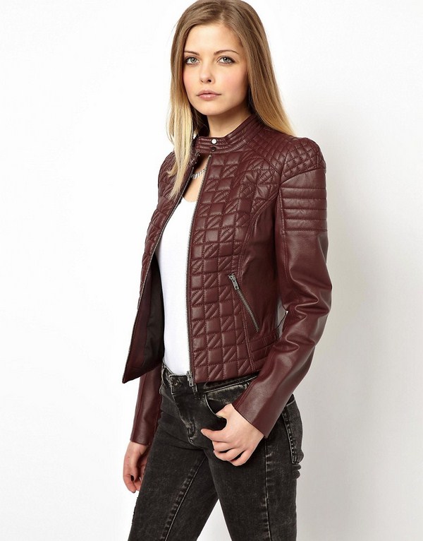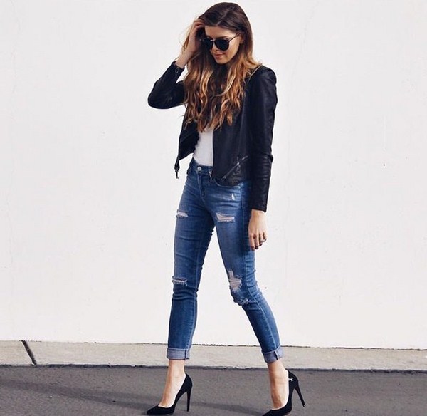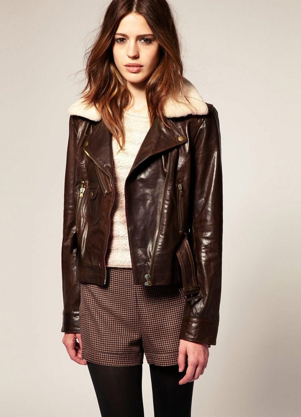 Jaket kulit bergaya sempurna digabungkan dalam busana malam bergaya dengan pakaian dalam gaya yang berbeza dan aksesori yang cantik.