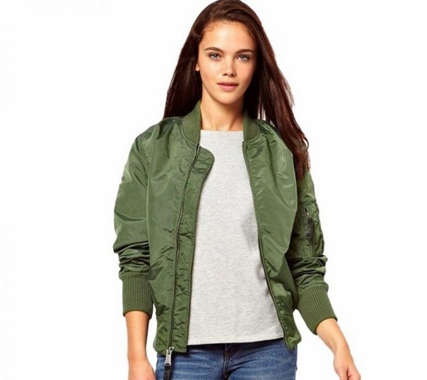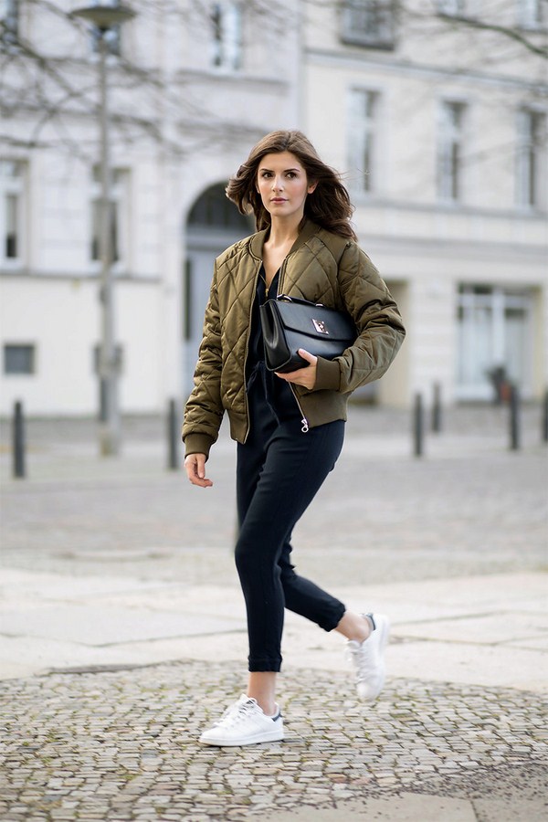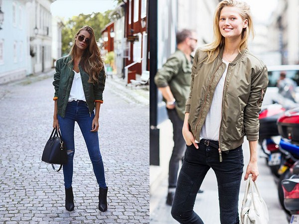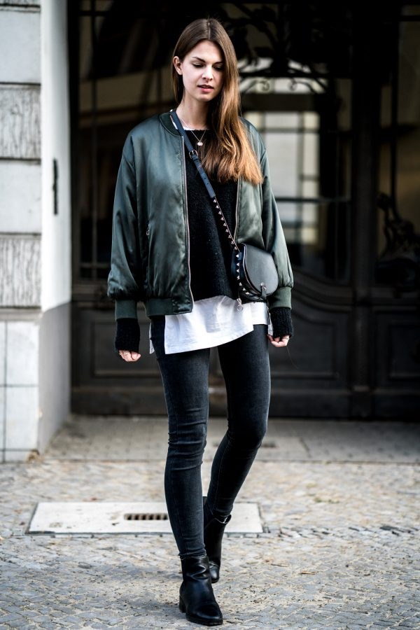 Pelengkap jaket pengebom yang bergaya dengan seluar jeans atau pakaian, serta kasut atau baju persalinan, dan mencari jalan kaki atau bertemu dengan kawan-kawan sudah siap.