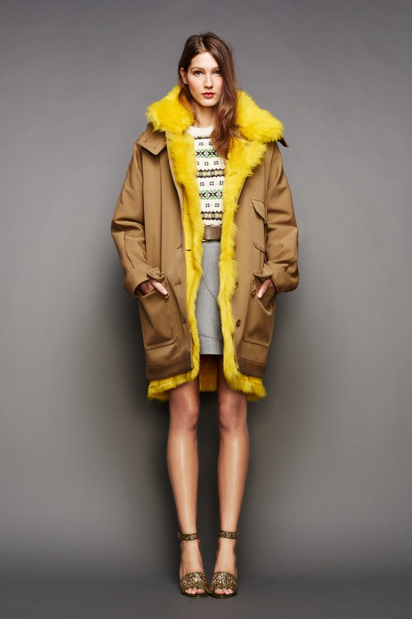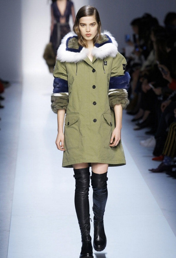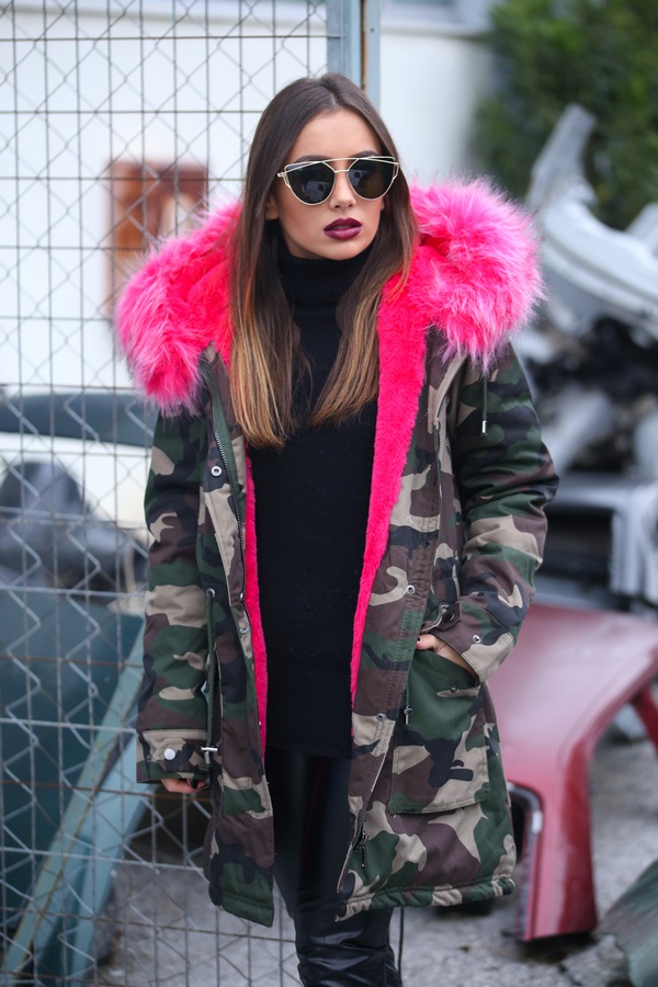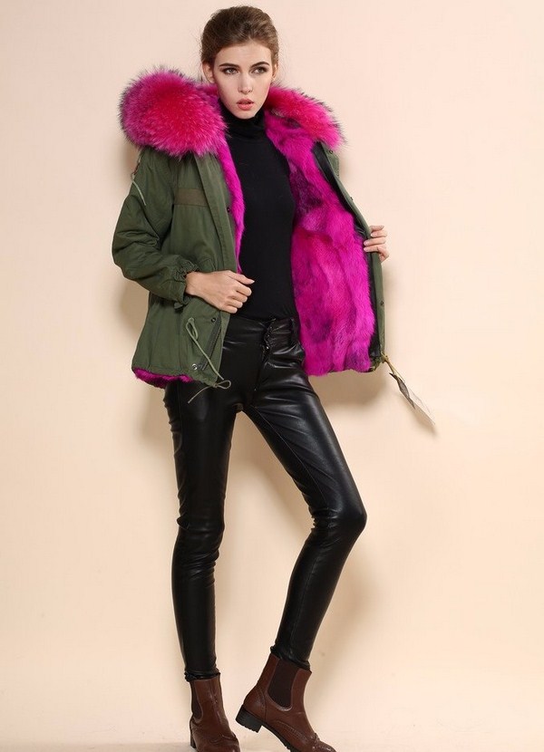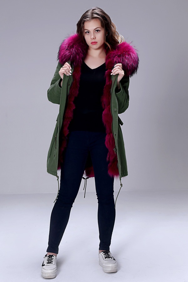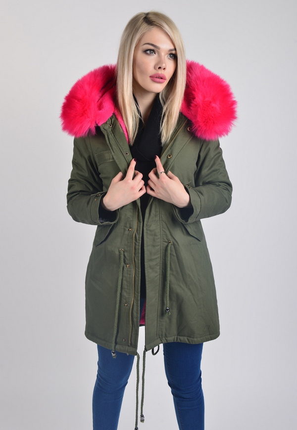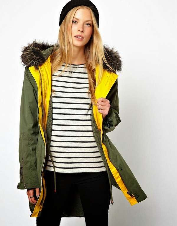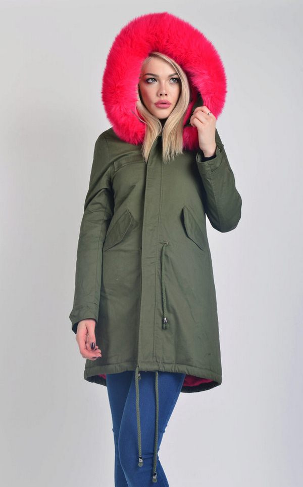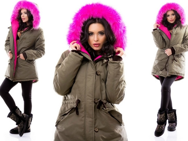Jaket parka asal boleh sama dengan kemasan cerah dalam bentuk bulu fuchsia atau kuning, dan jaket itu sendiri juga boleh berwarna merah, kuning, lembut.
