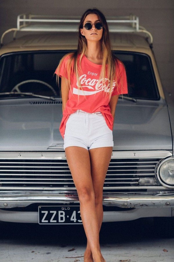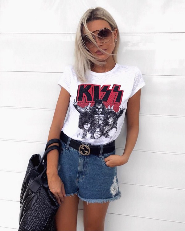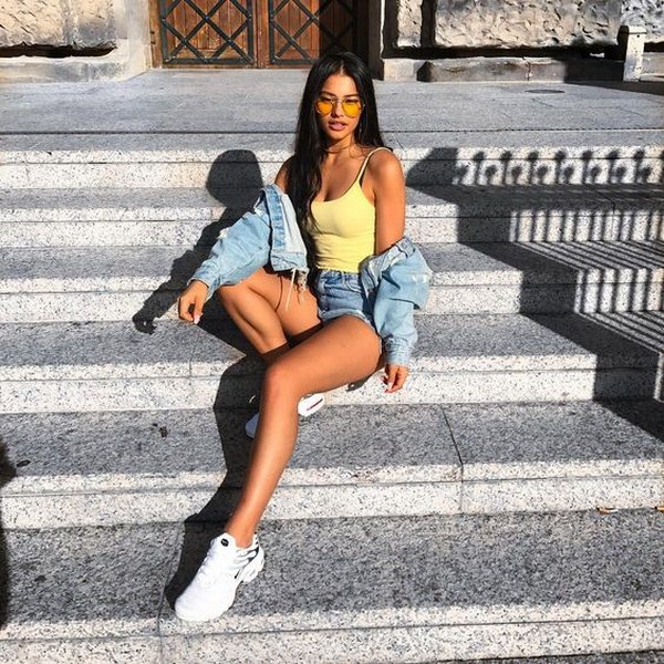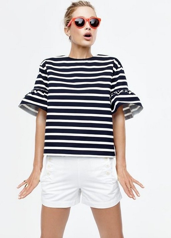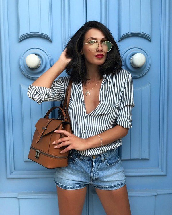 Seluar pendek denim untuk musim panas kelihatan sempurna dengan baju bergaris dalam nada putih hitam atau putih-putih, topi, kacamata bergaya dan sandal baji atau berbual.