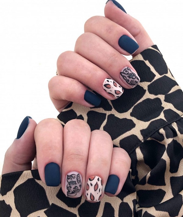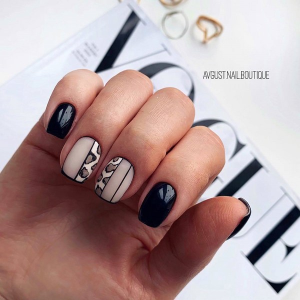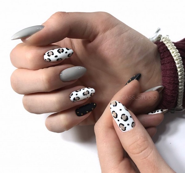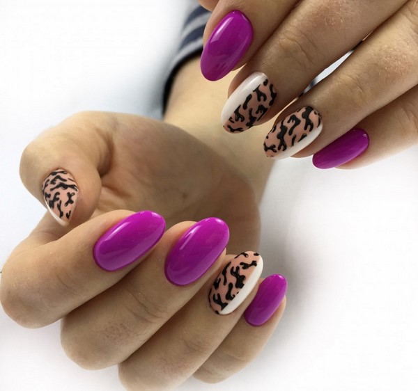Cetakan yang tidak biasa pada kuku bergaya yang mengulang corak pada kulit haiwan akan menjadi trend bergaya dalam reka bentuk seni kuku. Profesional terkemuka dalam manicure menawarkan berani menggabungkan kuku bergaya dengan cetakan ini, serta kuku merah, ungu dan biru cerah, melengkapkan reka bentuk kreatif dengan jalur dan berkilau.