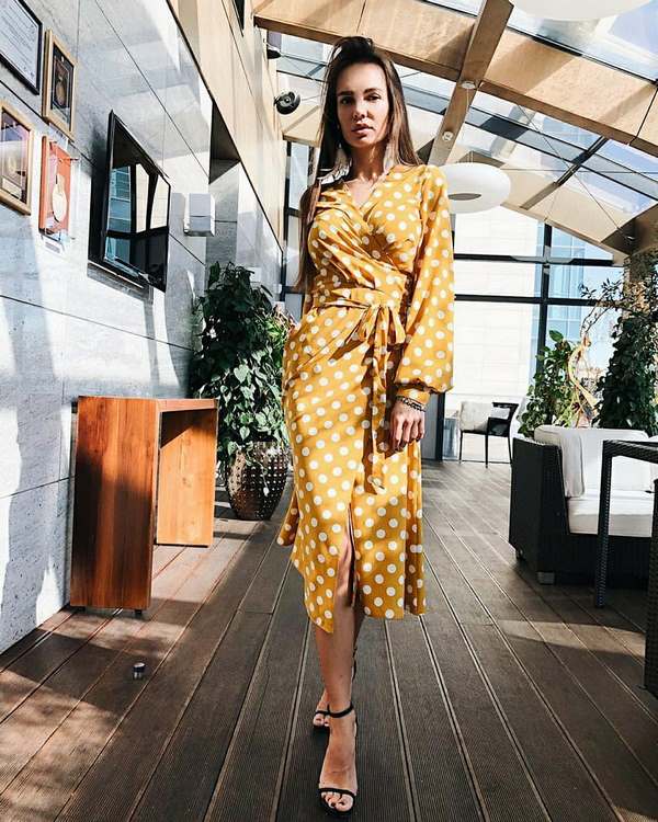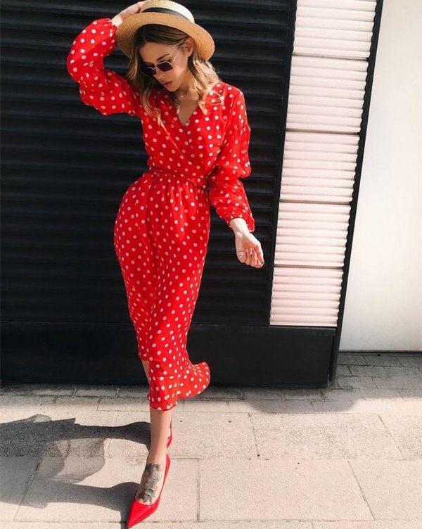 Trend panas musim ini adalah pakaian midi dengan kacang comel. Jika anda ingin mencipta rupa yang megah dan halus, maka pakaian seperti panjang midi dengan gaya titik polka akan sangat berguna untuk anda. Gaun Midi dengan titik polka dengan lengan lengan panjang, tali pinggang di pinggang, dan juga dengan celah yang membuka kaki akan menjadi bergaya.