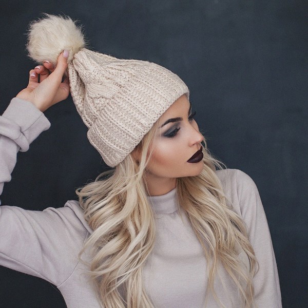 Kehadiran pompom juga membolehkan anda untuk memanjangkan bayang-bayang yang visual, yang berguna untuk perempuan yang pendek. Topi rajutan yang bergaya dengan pompom dibentangkan dalam pelbagai warna - warna cerah dan tenang, serta kombinasi warna yang luar biasa.