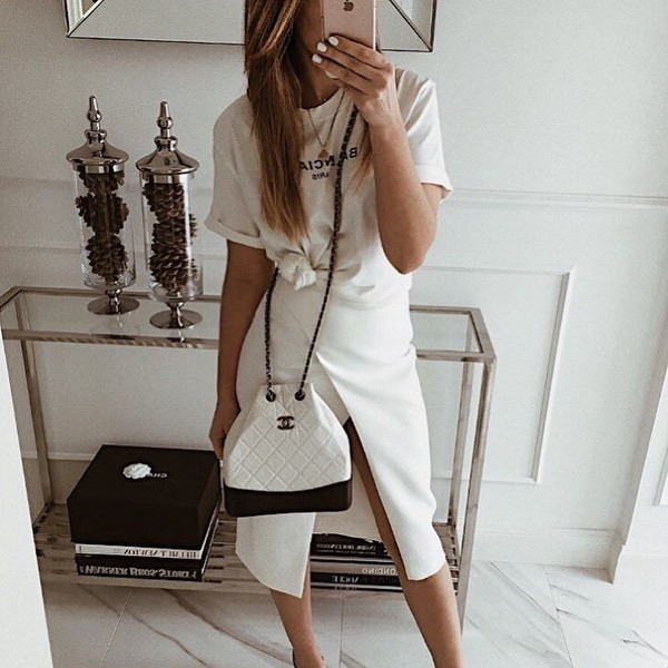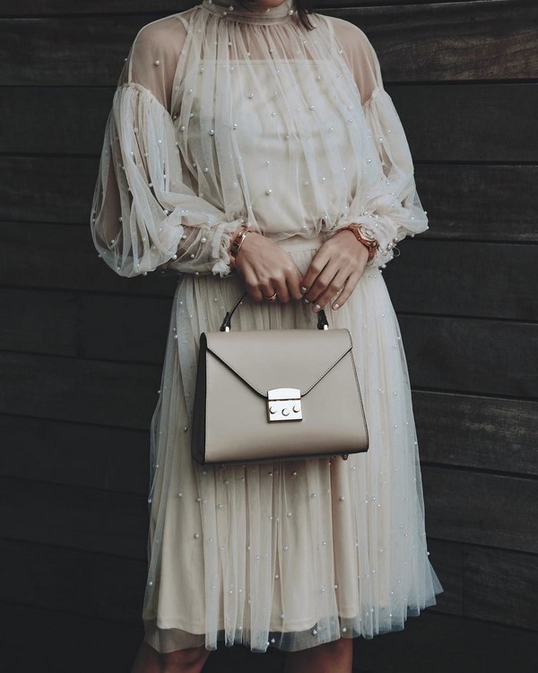 Pereka mencadangkan memakai beg segi empat tepat bergaya 2025-2026 pada bahu atau di tangan. Model segi empat tepat beg itu dibuat pada tali atau rantai yang tipis, yang memberikan keanggunan dan kecanggihan pakaian wanita.