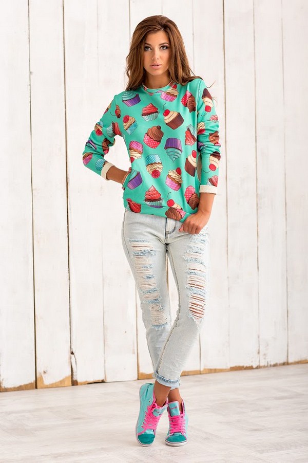 Kain bergaya boleh dipakai dengan pelbagai cetakan yang menghiasi jenis sweater ini - ini boleh sama ada motif bunga romantis atau haiwan kecil yang lucu.