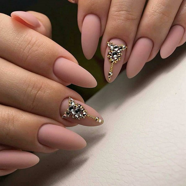 Versi manicure yang benar untuk kuku panjang boleh dibuat dengan rhinestones yang indah, dipilih dalam bentuk angka yang berbeza, mahkota, jalur sepanjang marigold atau meliputi lunula. Ia boleh menjadi rekaan monophonic kuku panjang dengan rhinestones, serta reka bentuk bulan, ombre, seni kuku elegan.