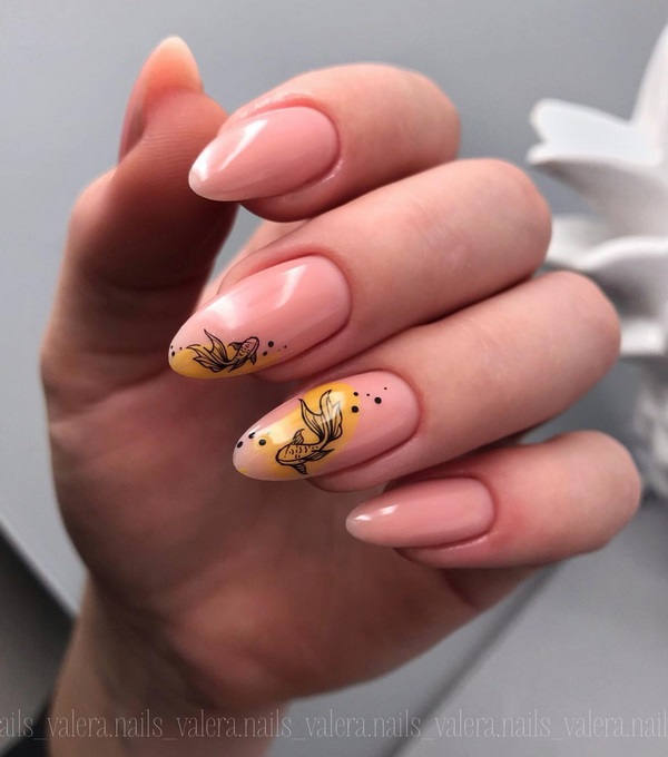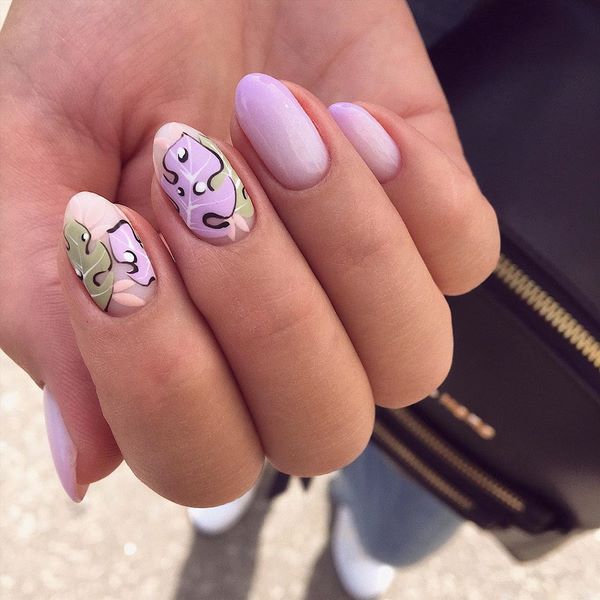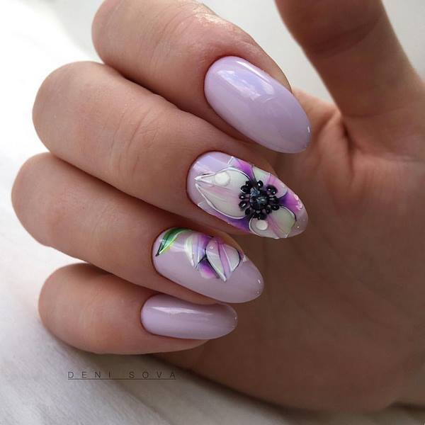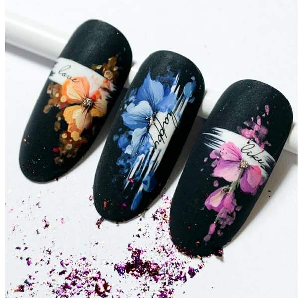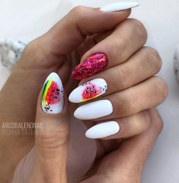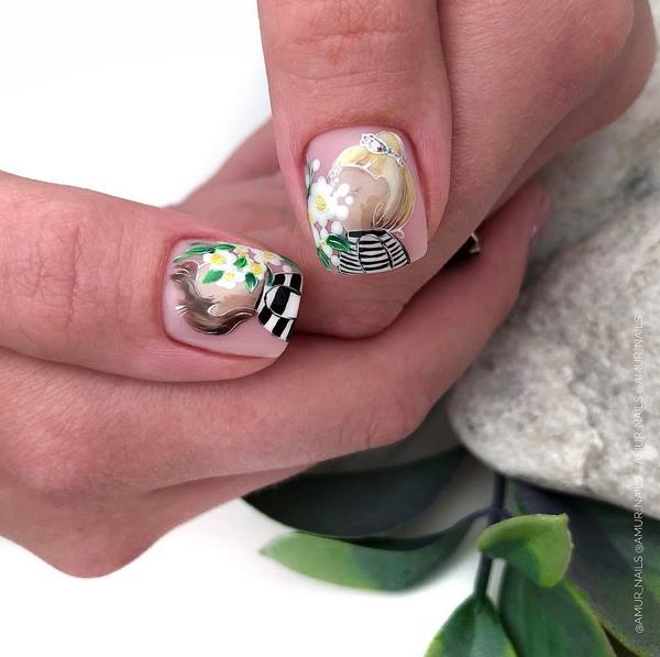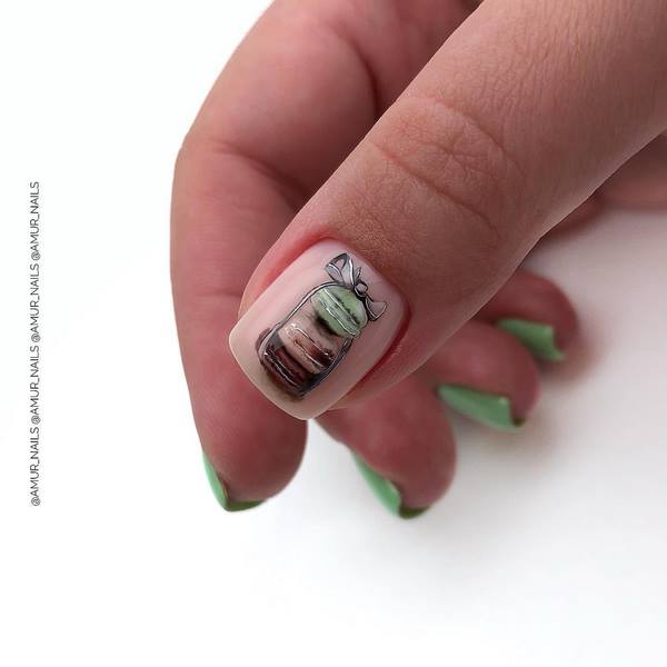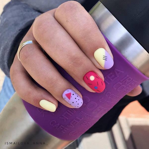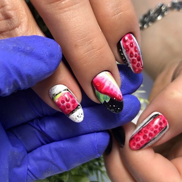 Manicure yang cantik dan bergaya 2025-2026 diwakili oleh pilihan dengan lukisan, yang boleh dalam bentuk pelekat, contohnya, buah-buahan dan bunga cerah atau kuku manikur, yang membolehkan anda membuat lukisan halus dengan banyak keriting.