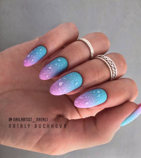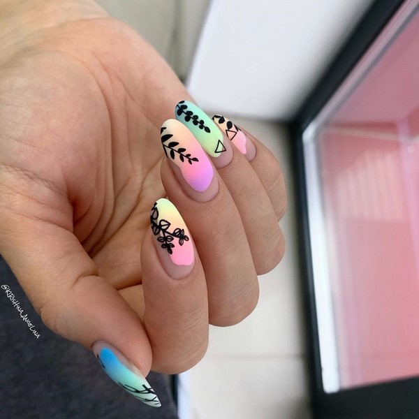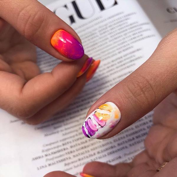 Untuk membuat manicure ombre yang bergaya, pilih skema warna yang paling luar biasa dan gunakan bukan sahaja peralihan warna mendatar yang biasa kepada kami, tetapi juga menegak dan pepenjuru.