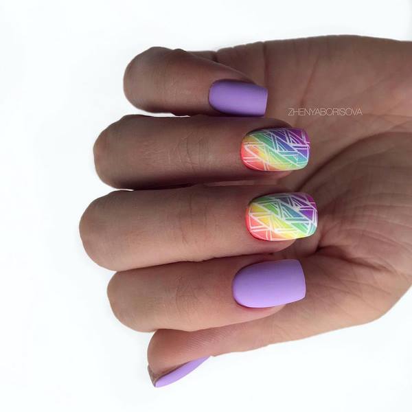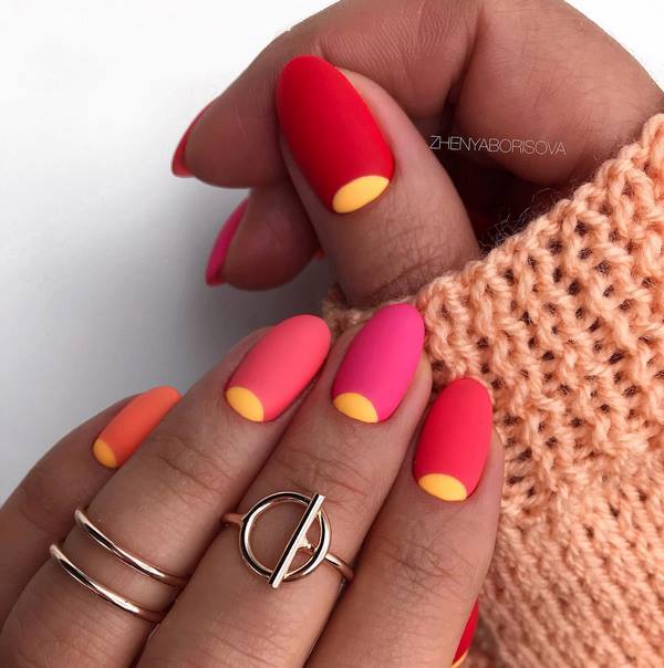Rasa bebas menggunakan beberapa warna varnis, serta bukan peralihan warna secara langsung, tetapi zigzag, yang akan mencipta manicure ombre yang menarik 2025-2026.