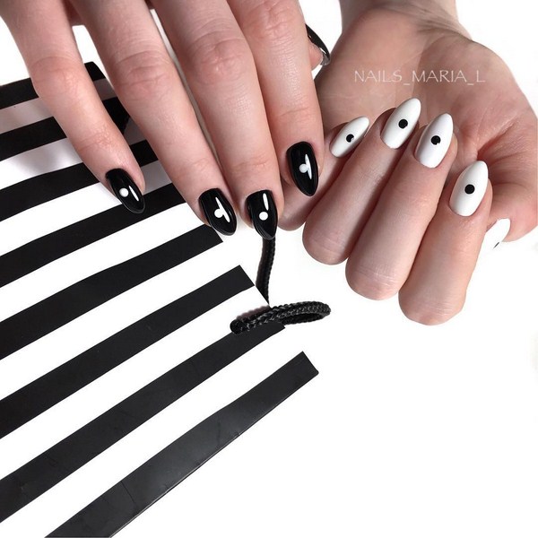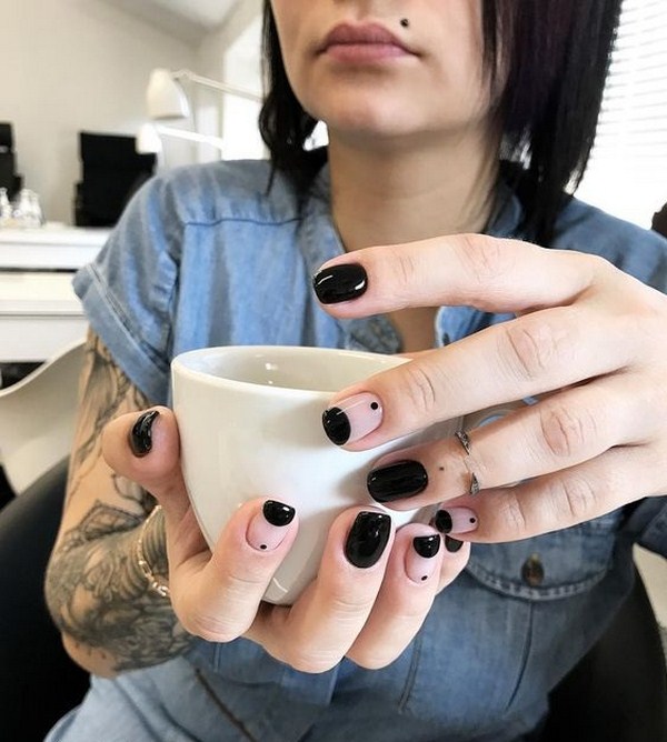 Manicure cat titik pintar mencadangkan kemungkinan manikur polka dot dalam gaya retro, hiasan renda, dot Perancis, "ruang negatif" dengan titik-titik, "mekar manis", reka bentuk bulan dan, tentu saja, minimalism tidak dapat difikirkan tanpa reka bentuk titik.