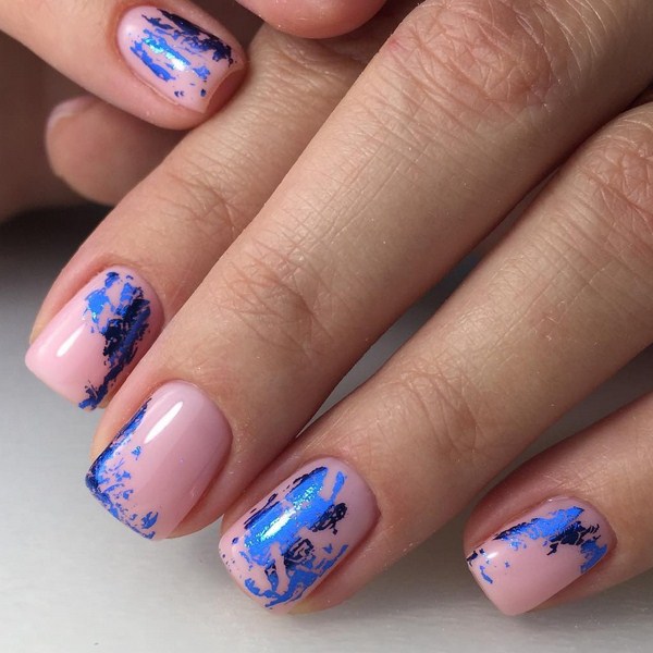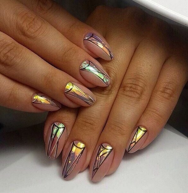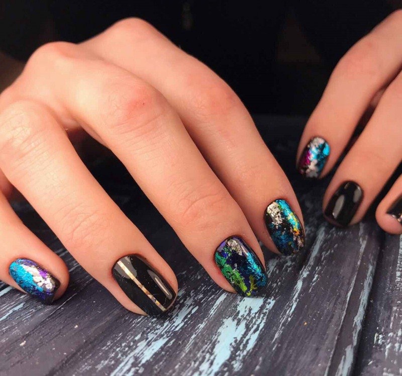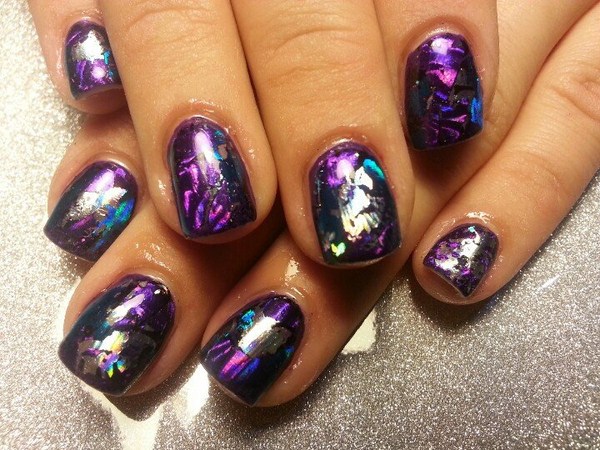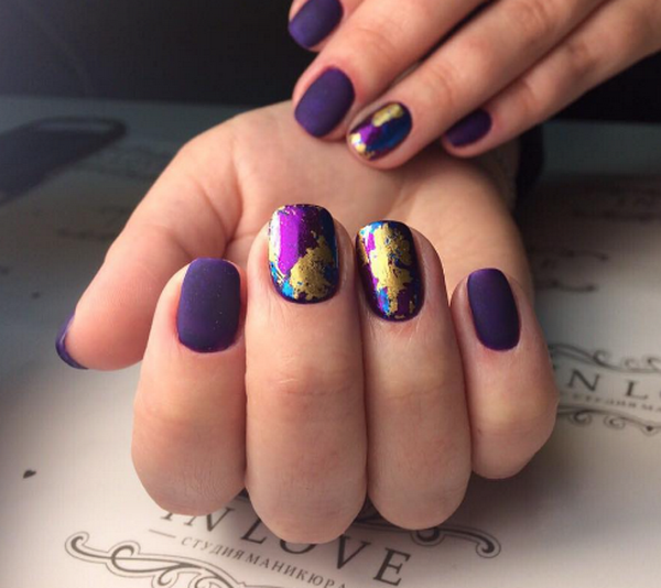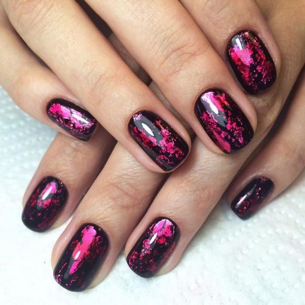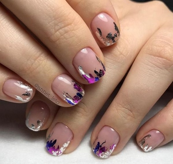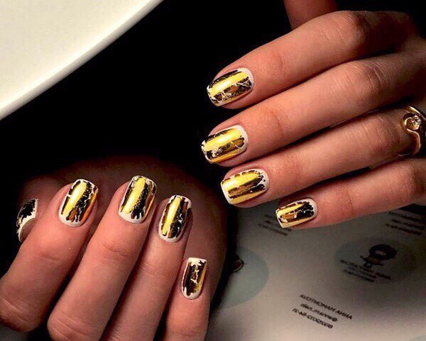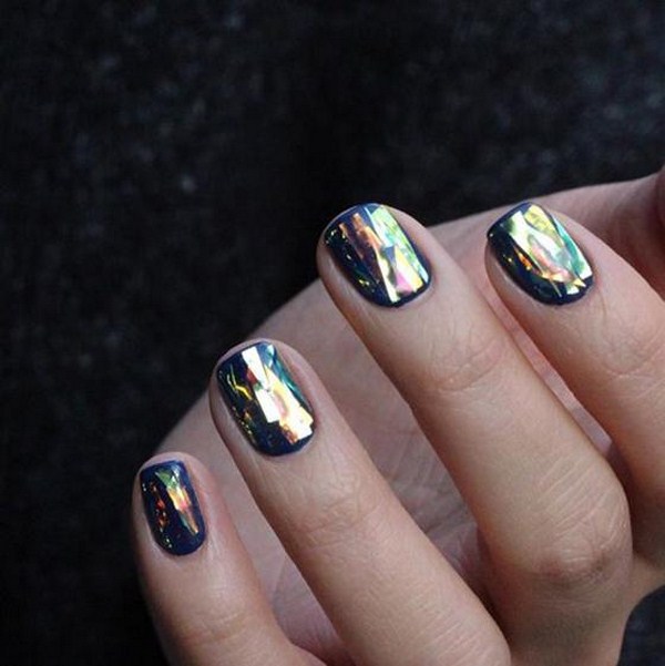 Tidak kurang manicure trendi adalah "kaca pecah", yang juga dilakukan menggunakan kepingan filem foil, yang tercermin di bawah salutan gel menggilap, menghasilkan limpahan yang luar biasa pada kuku.