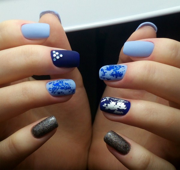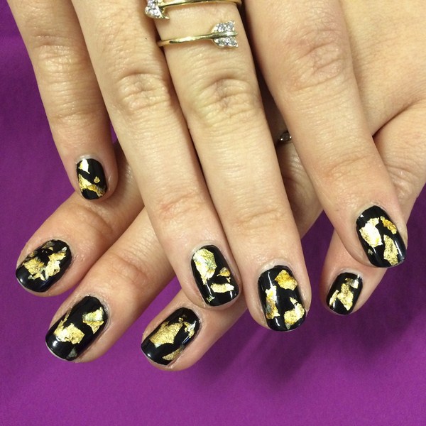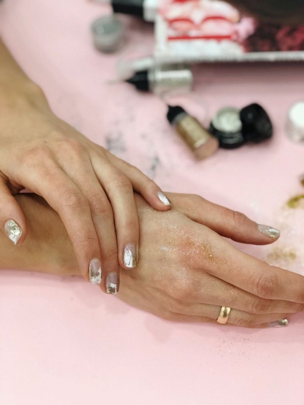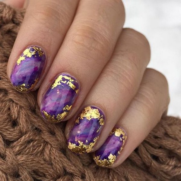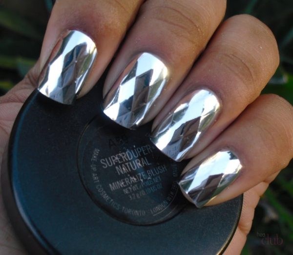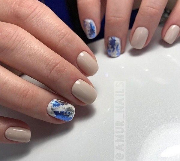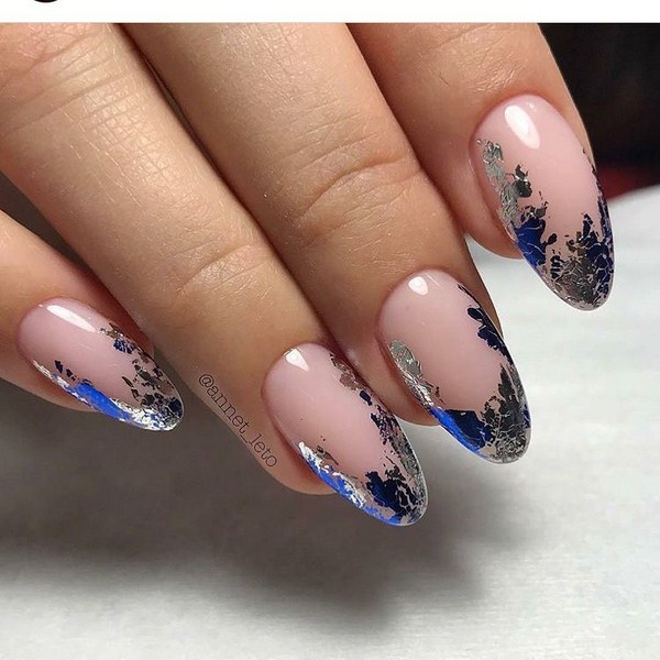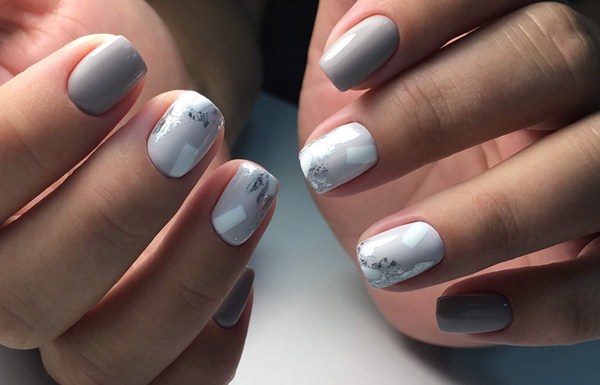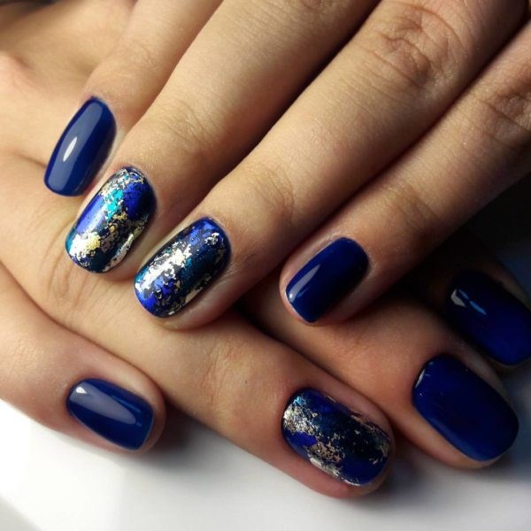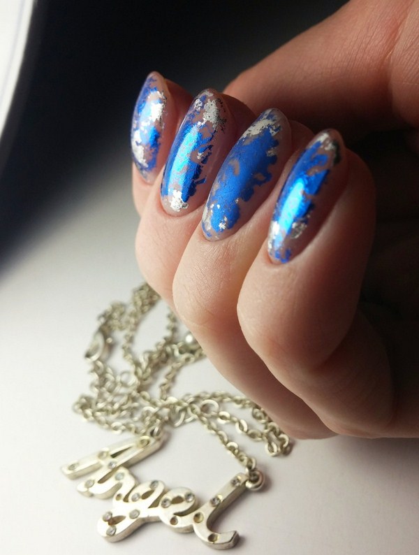 Tidak kurang manicure trendi adalah "kaca pecah", yang juga dilakukan menggunakan kepingan filem foil, yang tercermin di bawah salutan gel menggilap, menghasilkan limpahan yang luar biasa pada kuku.