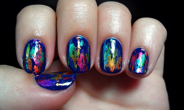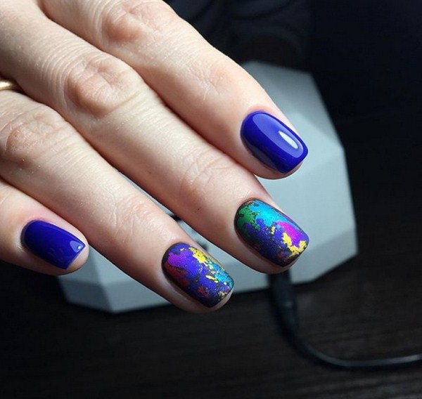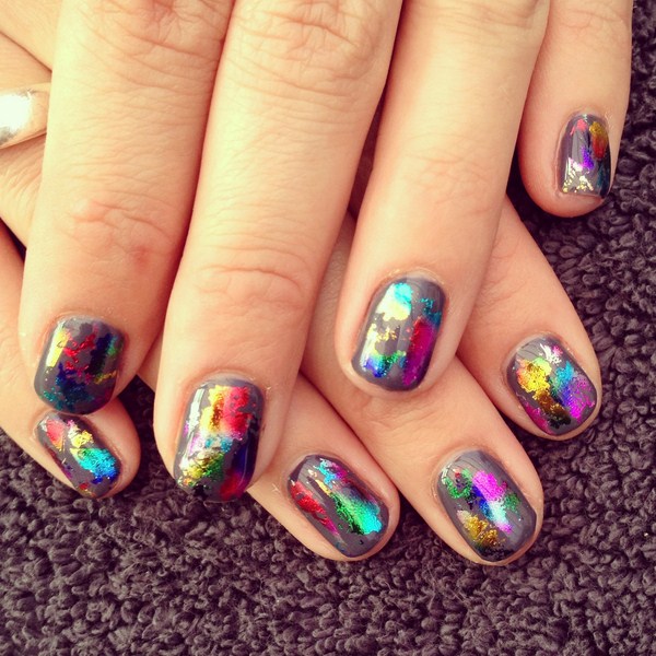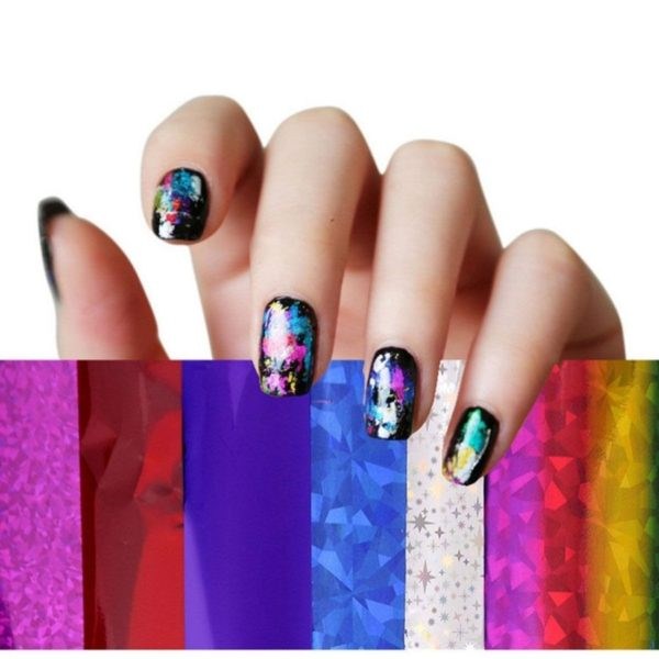 Untuk melakukan reka bentuk kuku yang menyeronokkan dan berkesan dengan kerajang, warna yang berbeza akan membantu, yang menyerupai pelangi pada kuku. Untuk melakukan ini, anda hanya perlu menutup kuku dengan naungan varnis kegemaran anda, dan kemudian gunakan kerajang pemindahan dalam warna yang berbeza, yang akan membolehkan anda mencapai kecantikan yang luar biasa.