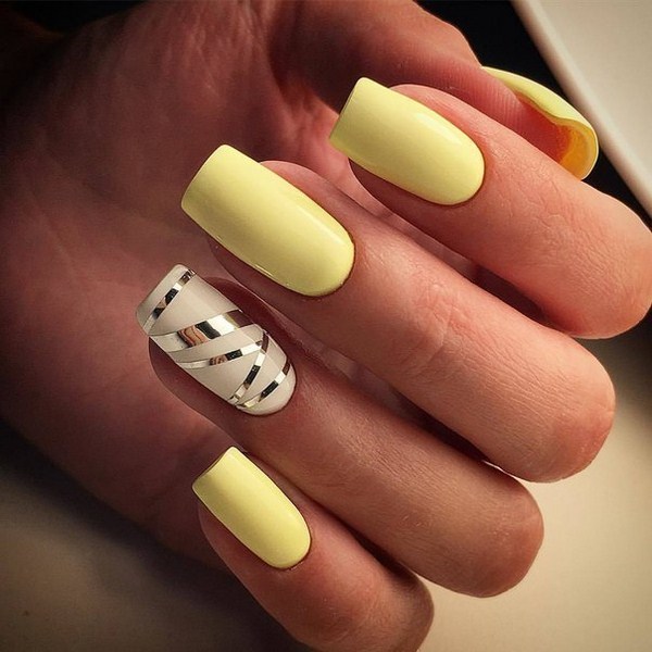 Pandangan yang bergaya dan ringkas dari kuku dengan kerajang adalah manicure dengan jalur, yang relevan untuk setiap imej, baik setiap hari, perniagaan, dan elegan.