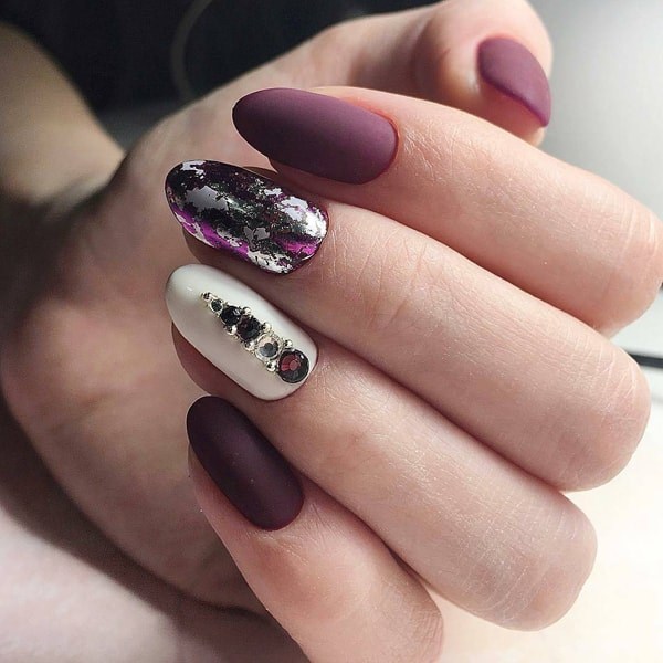 Sebagai idea reka bentuk bulan dengan kerajang, anda boleh memohon kemasan matte dalam warna merah dan coklat, berbeza hitam dan putih, serta mana-mana tempat kegemaran lain. Idea hebat adalah kerajang hitam dan emas, krim dan kepingan "pecah kaca", lubang emas dan matte merah, yang ditunjukkan dalam foto di galeri.