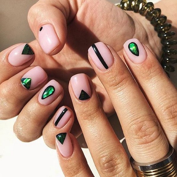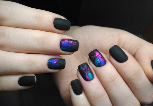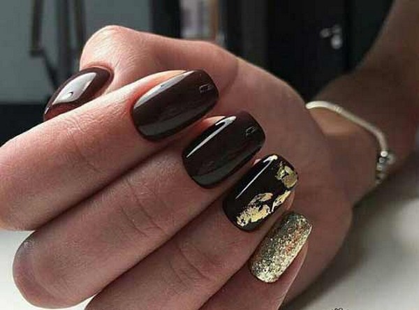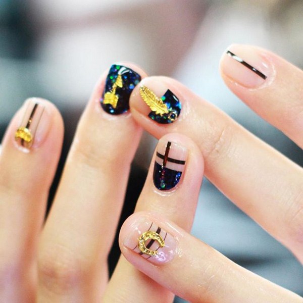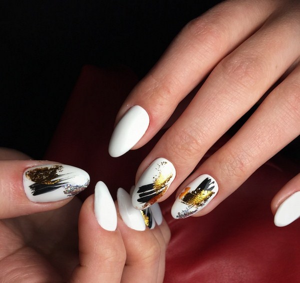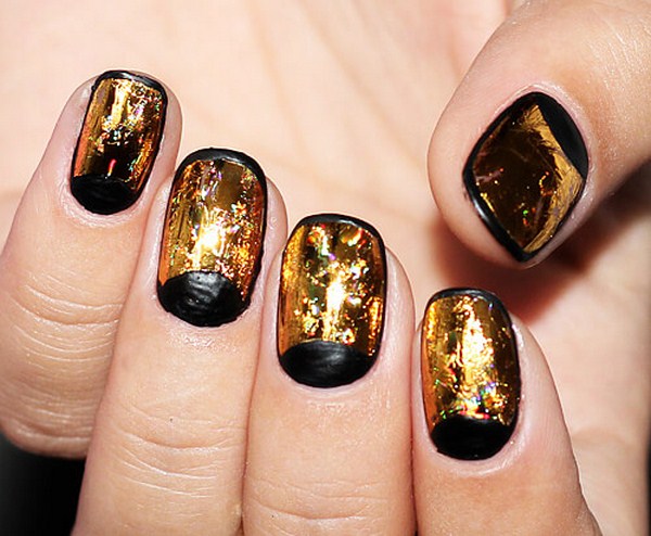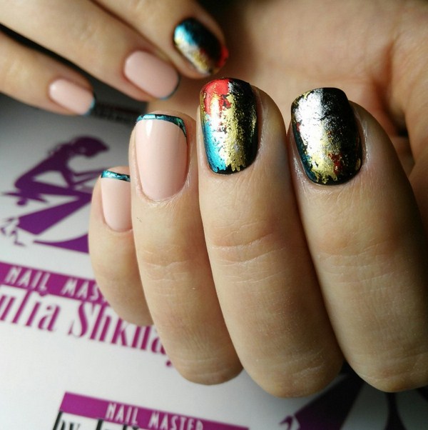 Untuk memberi keaslian, para tuan juga melengkapi reka bentuk semacam itu - "ruang negatif", memberikan kesungguhan kepada seni kuku, seperti manicure hitam dengan jalur emas foil dan salutan telus.