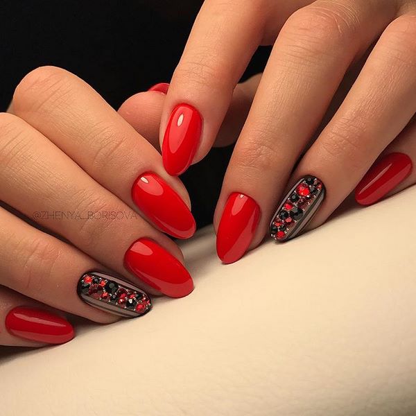 Manicure mewah dengan rhinestones yang dipadankan dengan nada varnis atau warna pakaian adalah peluang yang baik untuk melengkapkan busur malam yang sempurna dan tidak dapat dinafikan untuk sebarang acara.