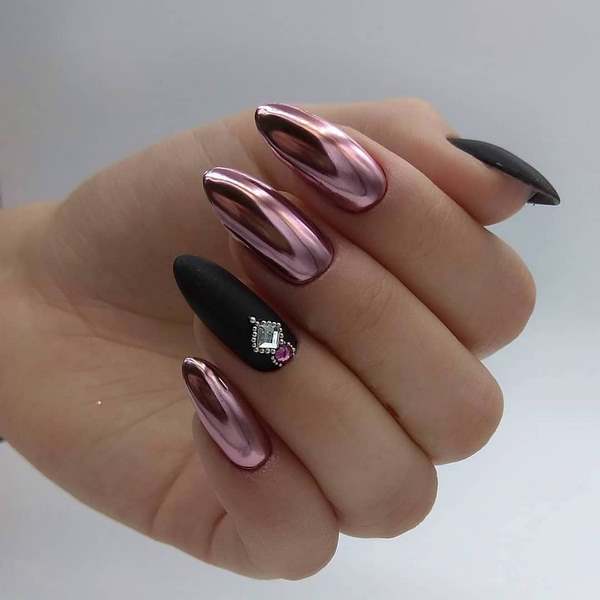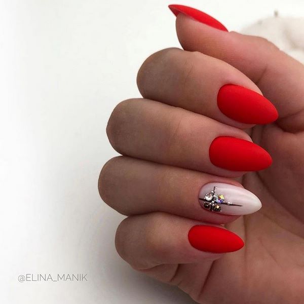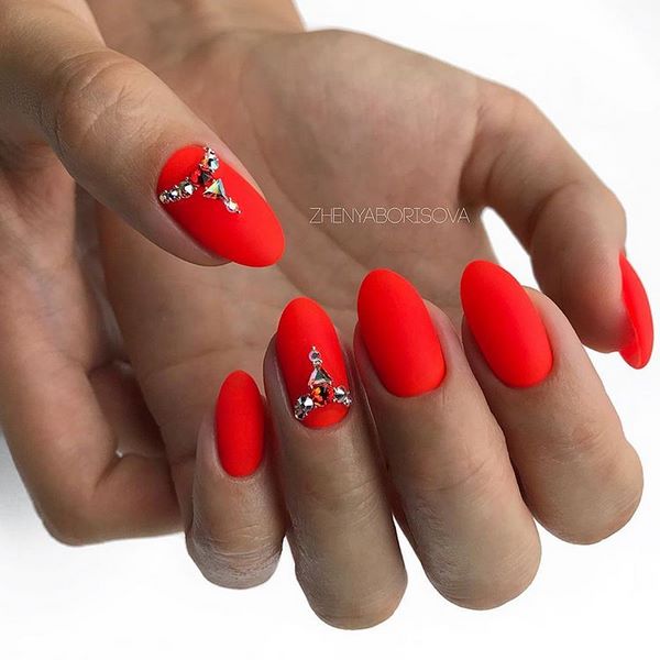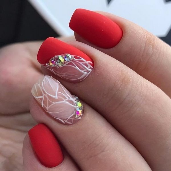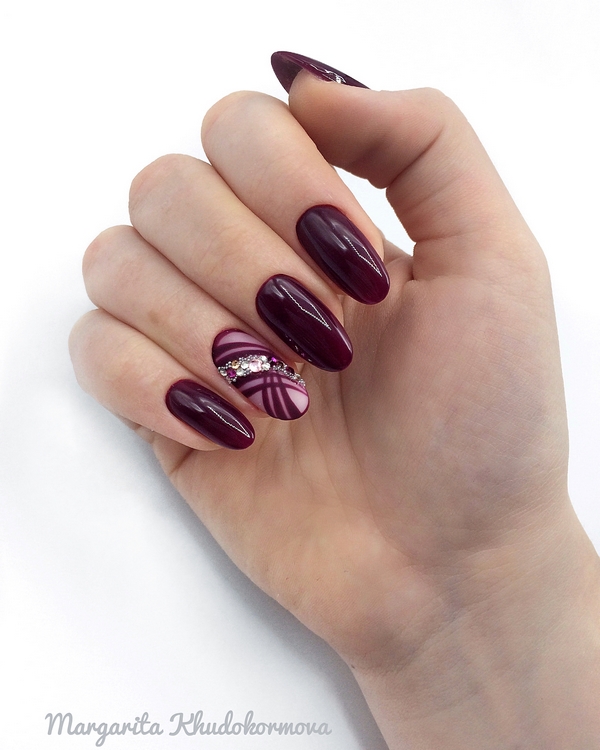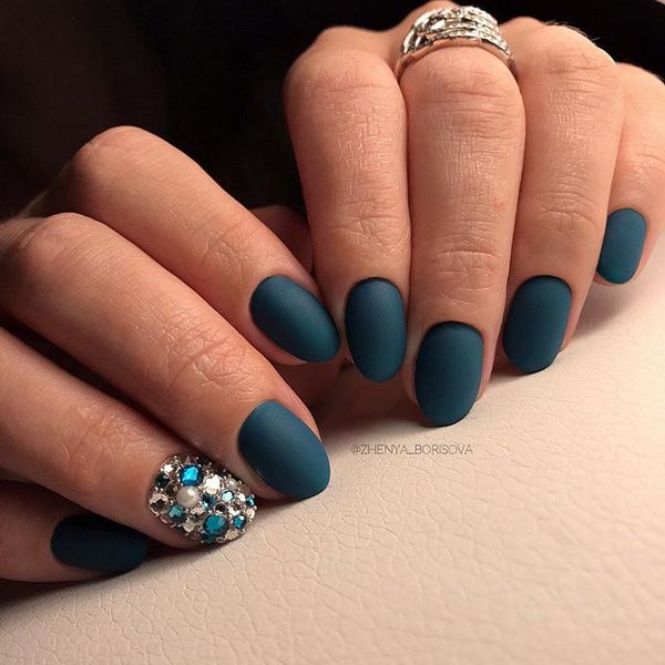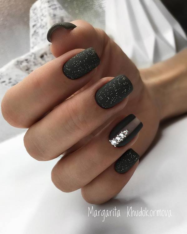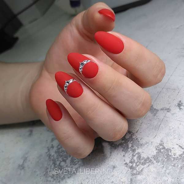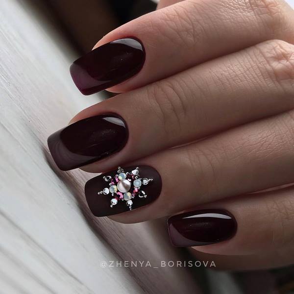 Idea yang baik untuk manicure dengan rhinestones dengan manicure matte di bawah naungan tepu - burgundy, zamrud, merah, hitam. Berkilau rhinestones menetapkan warna dalam pada kuku, mencipta manicure yang indah untuk majlis khas.