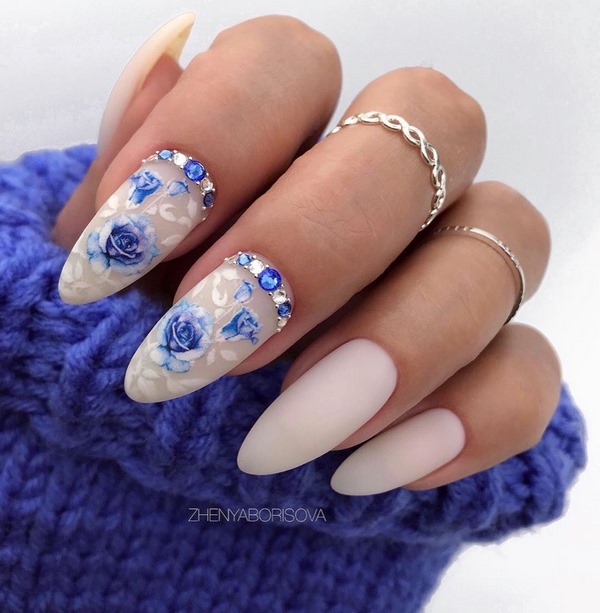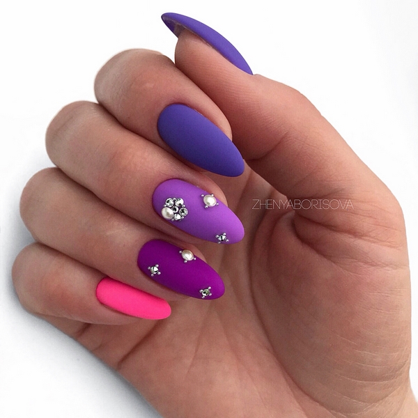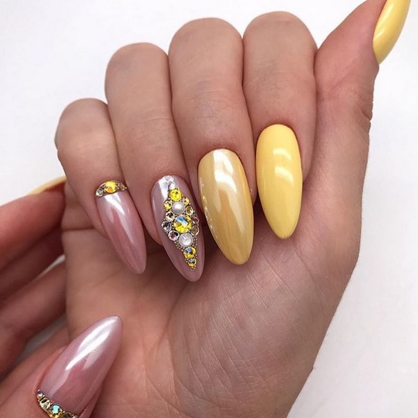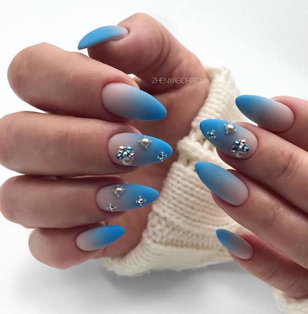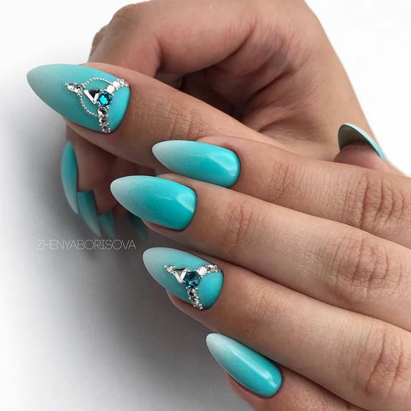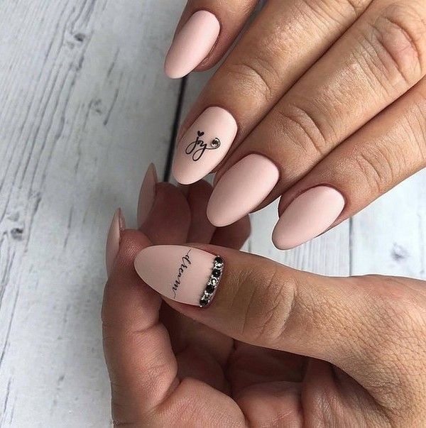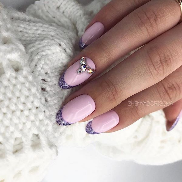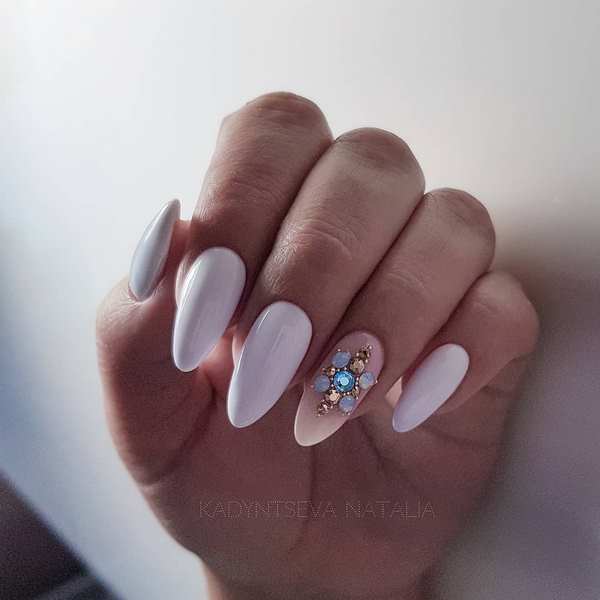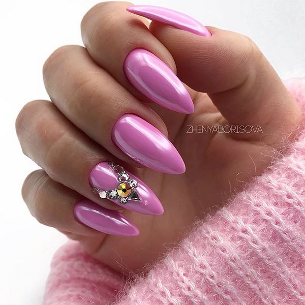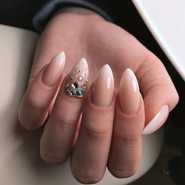 Untuk gadis-gadis yang lembut dan cantik, serta pada akhir rupa romantis, anda boleh membuat manikur pastel atau bogel dengan rhinestones pada kuku tajam, yang kelihatan tidak kurang cantik dan sangat bergaya.