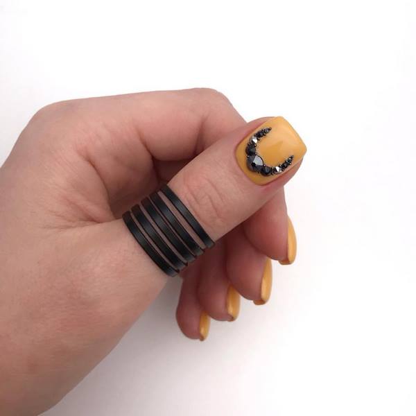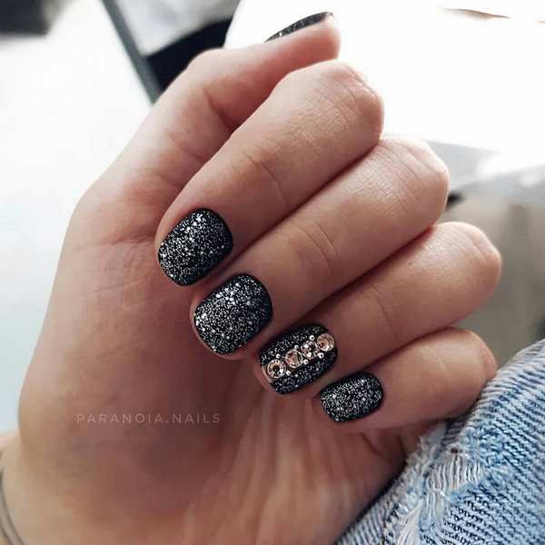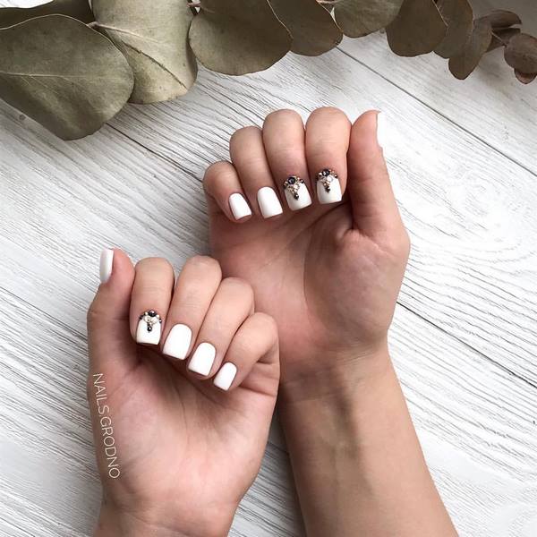 Anda juga boleh membuat pelbagai bentuk dari rhinestones dan meletakkan kerikil dalam bentuk tertentu, yang lebih tepat pada manicure monokrom untuk kuku pendek.