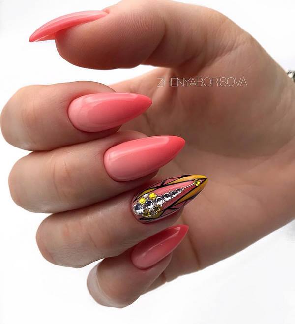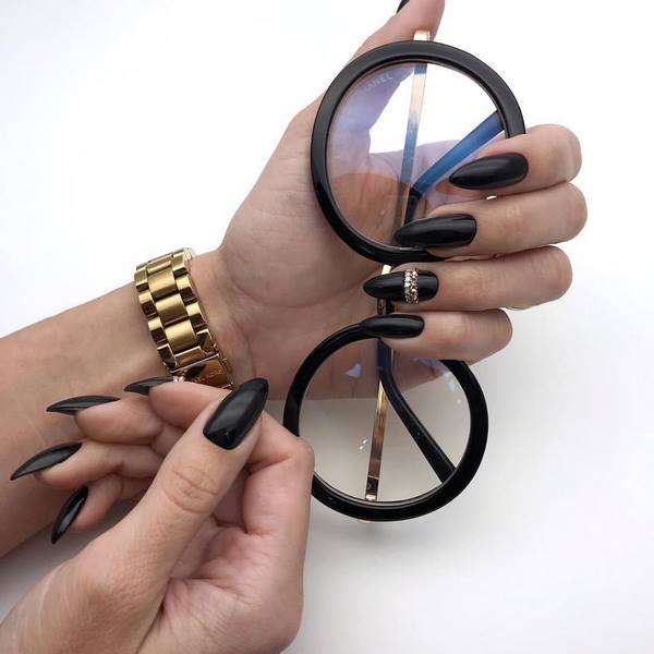 Manicure bergaya dengan rhinestones yang paling jelas dan dilupakan kelihatan pada kuku tajam yang menarik perhatian dan sangat luar biasa.