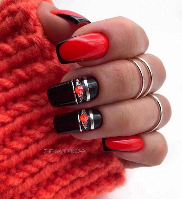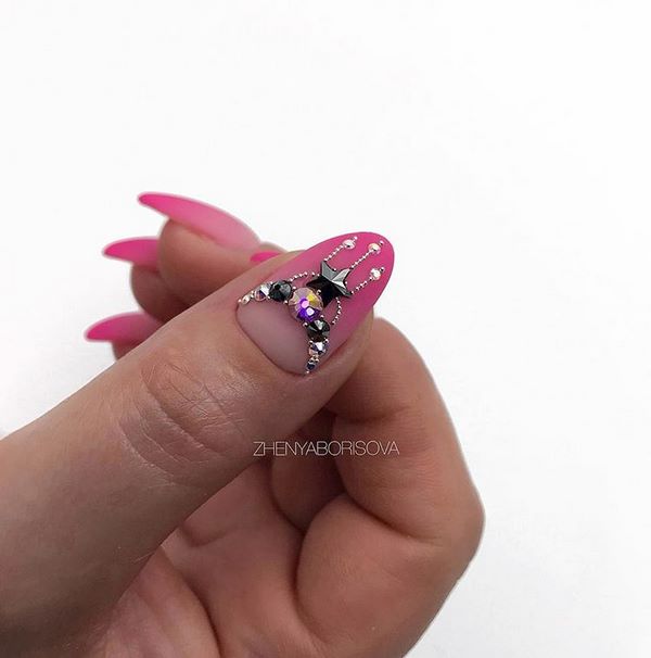 Adalah lebih baik untuk mencipta manicure dengan rhinestones pada kuku pendek, dengan hati-hati meletakkan batu-batu di sudut atau garis di dekat lubang, memilih batu-batu dari saiz atau warna yang berbeza untuk membuat aksen.