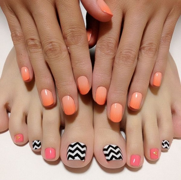 Ombre pedikur bergaya dan jaket dengan pengilat gel terang, serta pedikur monokrom terang dengan corak, hiasan dan pelekat.