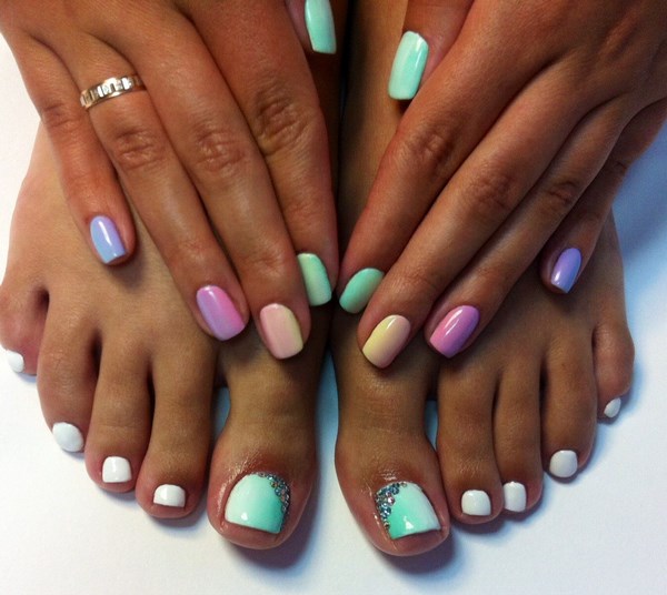 Pedicure bergaya dalam warna-warna terang: ungu muda, biru langit, merah jambu pucat, pic, kuning air kelihatan luar biasa cantik.