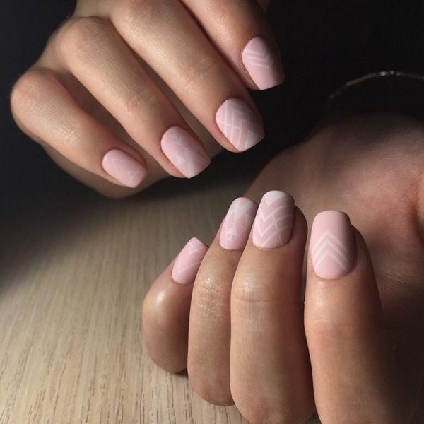 Cuba buat manicure pastel matte 2025-2026 dalam warna merah jambu dengan cetakan geometri yang halus yang tidak dapat dilihat, tetapi pada masa yang sama ia akan menambah sedikit semangat pada kuku.