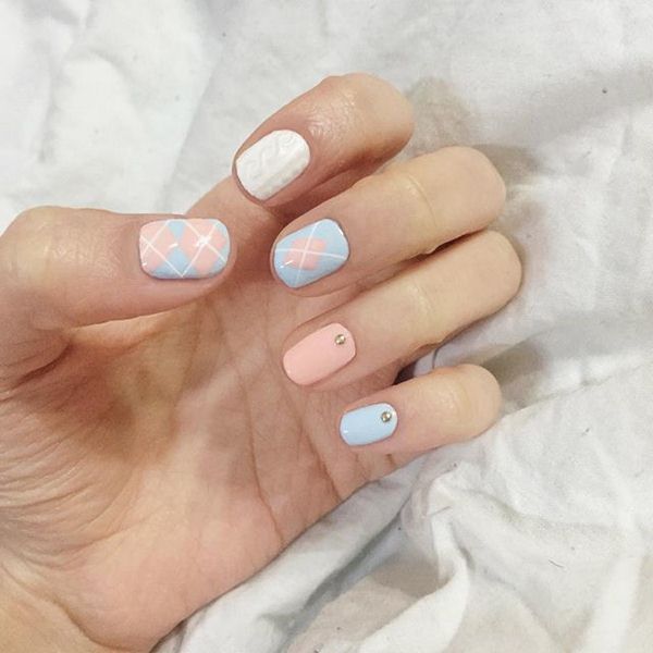 Anda juga boleh menghiasi pastel bergaya pada kuku menggunakan pelekat manicure yang indah melengkapkan manicure lembut dalam warna pastel.