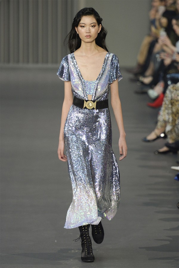- kilauan metalik, bulu dan cincin pada gaun;