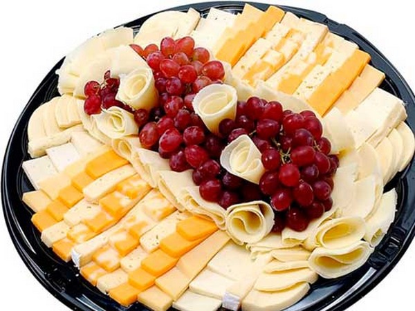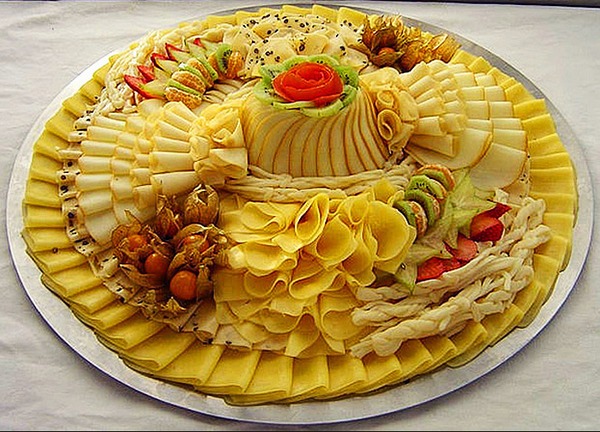 Keju boleh dihidangkan dalam kiub, kepingan, kepingan dan dengan cara yang anda suka. Potong besar boleh dipintal, meletakkan dalam bentuk keping keju di pinggir di pinggir, dan letakkan kepingan kecil di tengah.