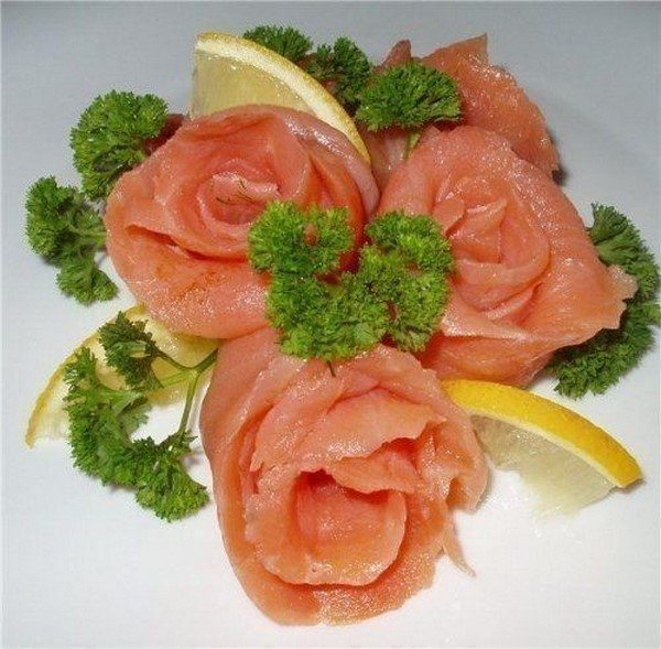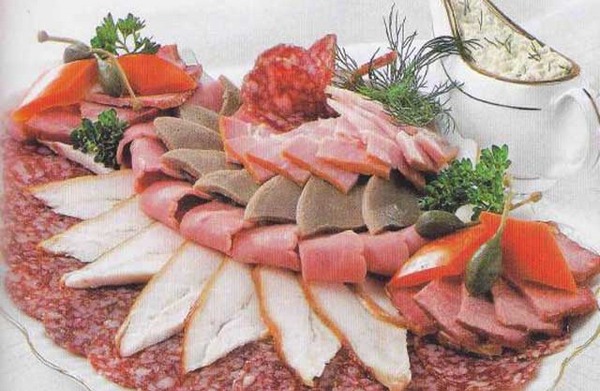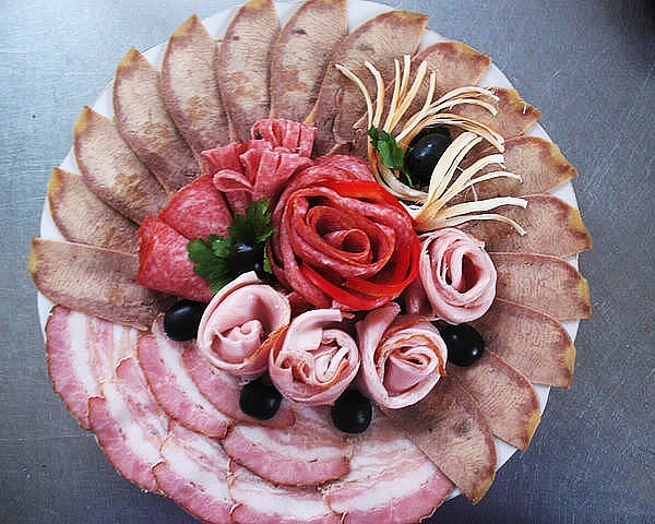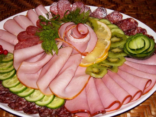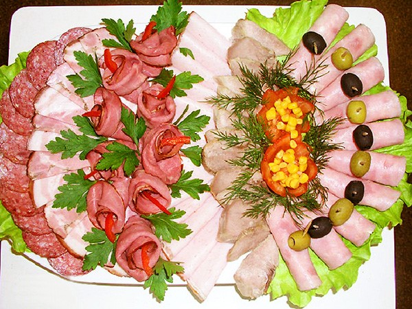 Percutian bercuti dengan gaya bunga yang dibuat dari daging atau sosej yang sama, "gulung" dan keriting yang boleh dipintal, atau dengan melipat kepingan yang dihiris dan mengamankannya dengan lidi juga kelihatan cantik, yang akan menghiasi meja dengan luka bercuti yang luar biasa.